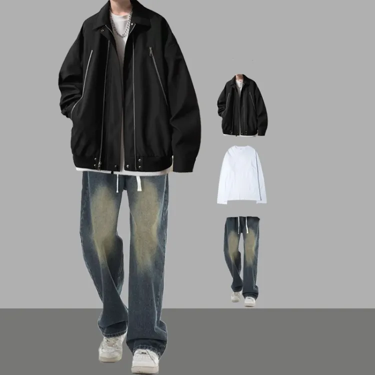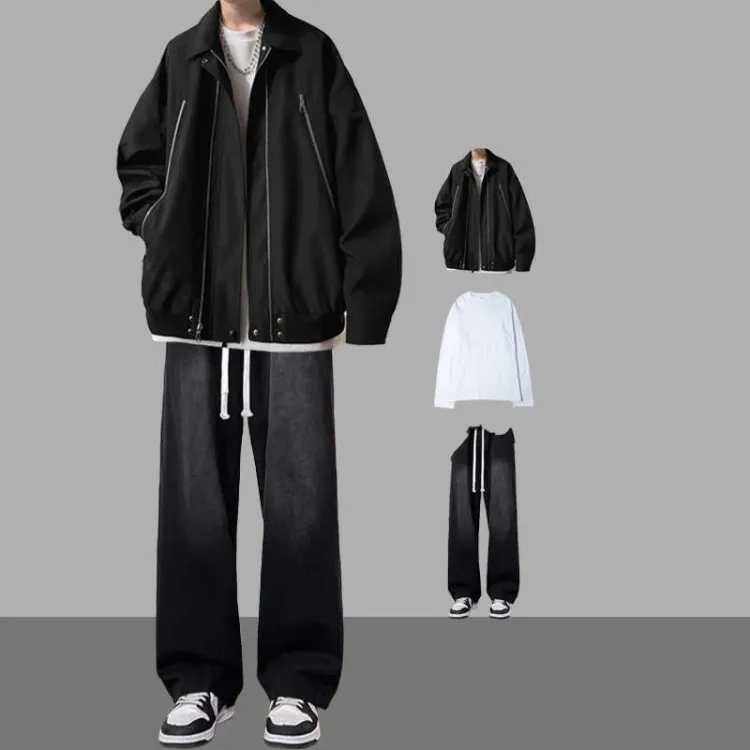 [Комплект из 3 предметов] Куртка черная + длинный белый + джинсы черные