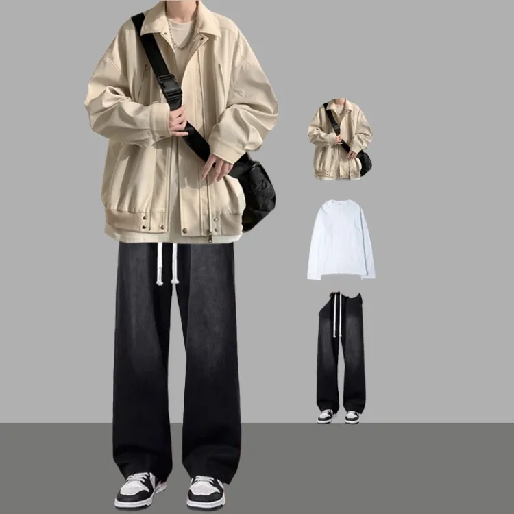 [Комплект из 3 предметов] Куртка Абрикос + Длинный Белый + Джинсы Черные