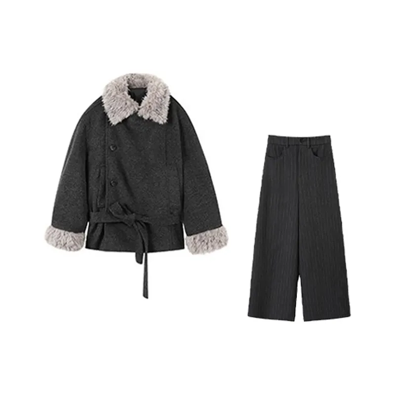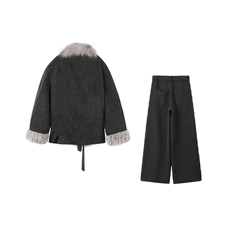 Комплект:Темно-серое пальто с меховым воротником + темно-серые широкие штаны