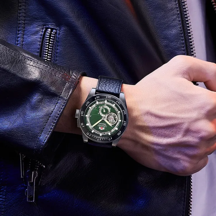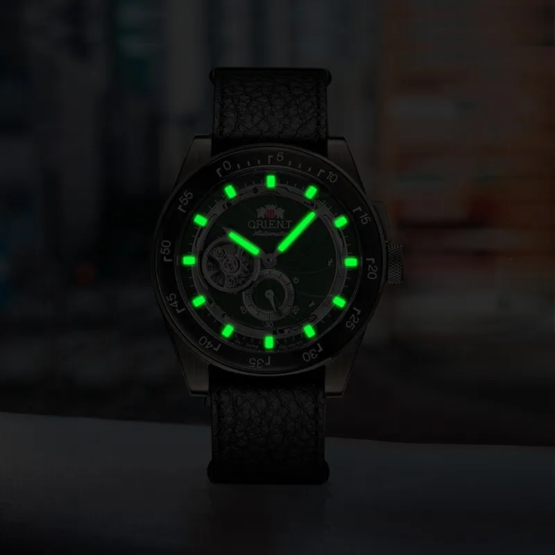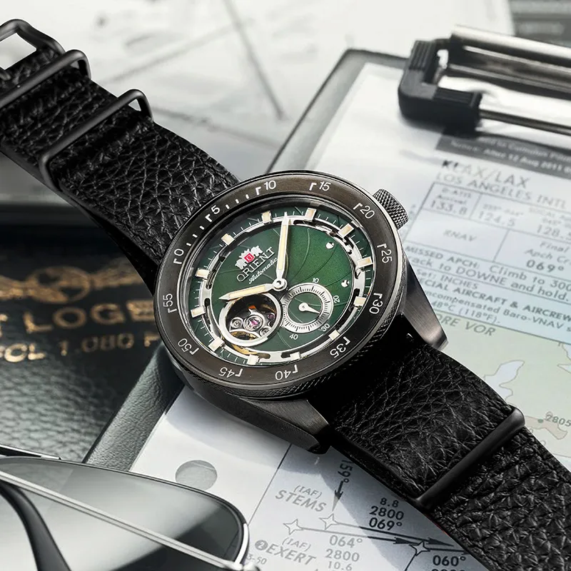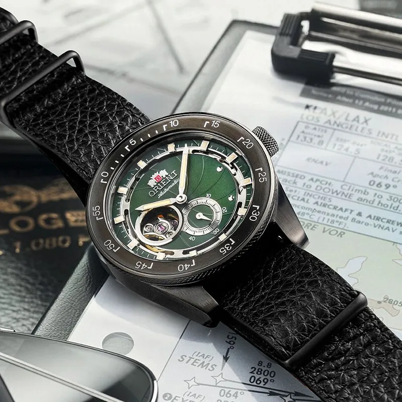 ORIENT Автоматический Механический Механизм Кожаный Ремешок Часы 40,85 мм Мужские Часы Зеленый Циферблат RA AR0202E