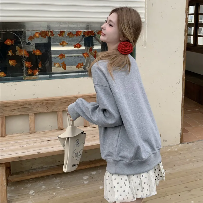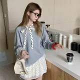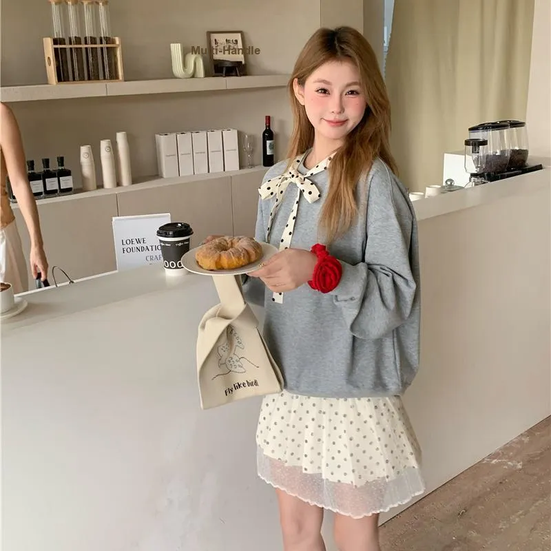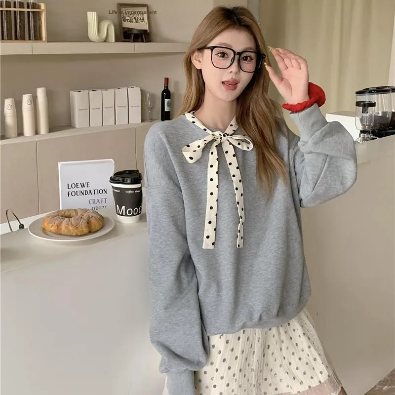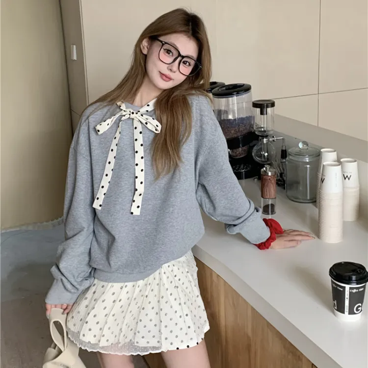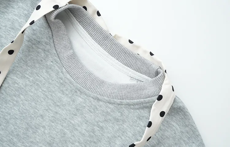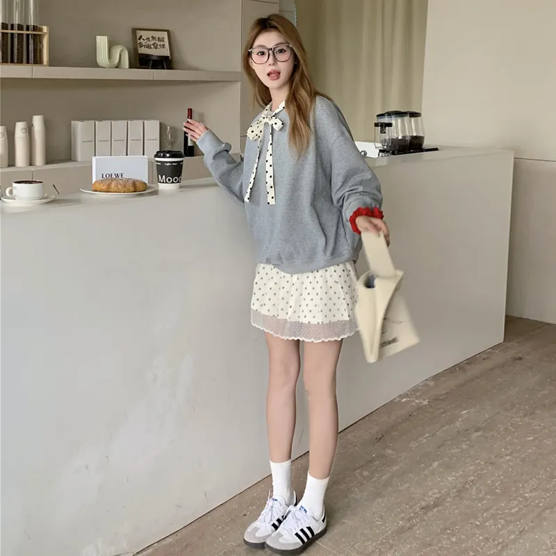Серый свитшот на шнуровке + юбка в горошек из марлевой ткани