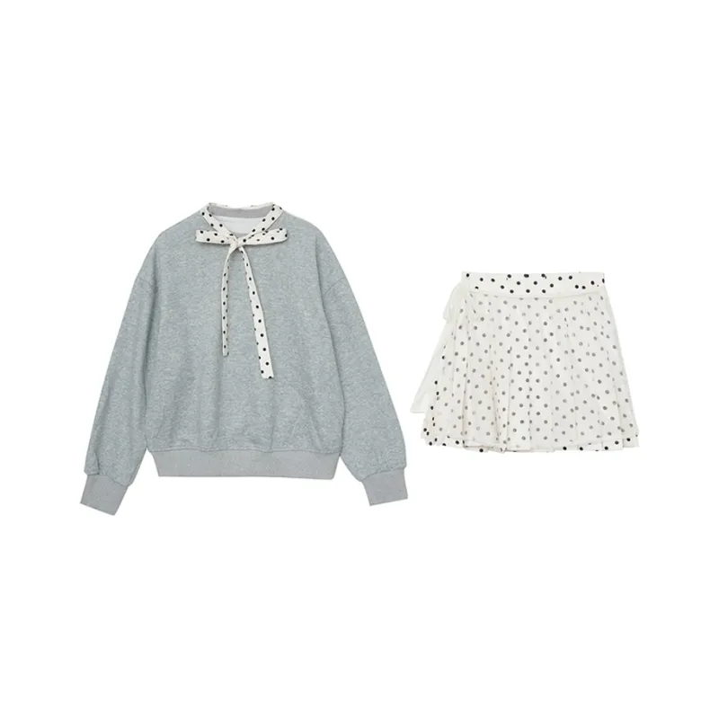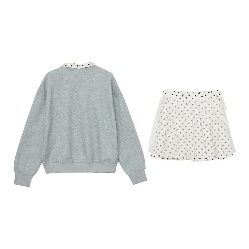 Комплект:Серый свитшот на шнуровке + юбка в горошек из марлевой ткани