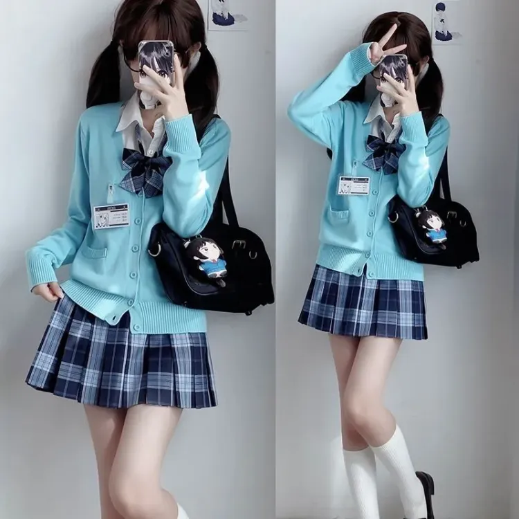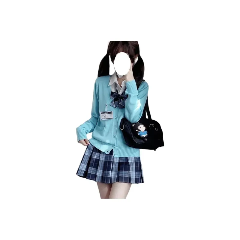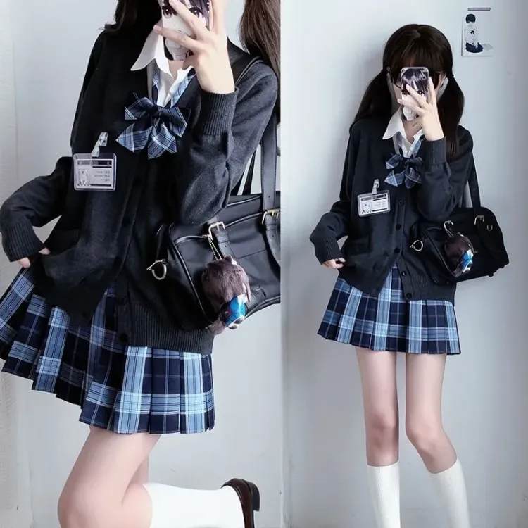 Морская трава Клетчатый Юбка + Темно-серый Кардиган + Галстуки-бабочки