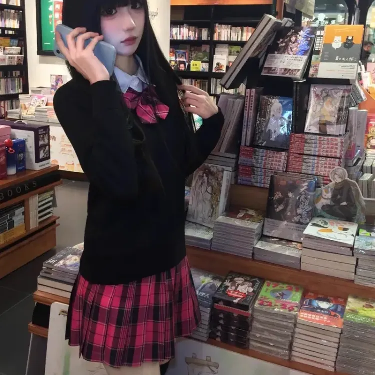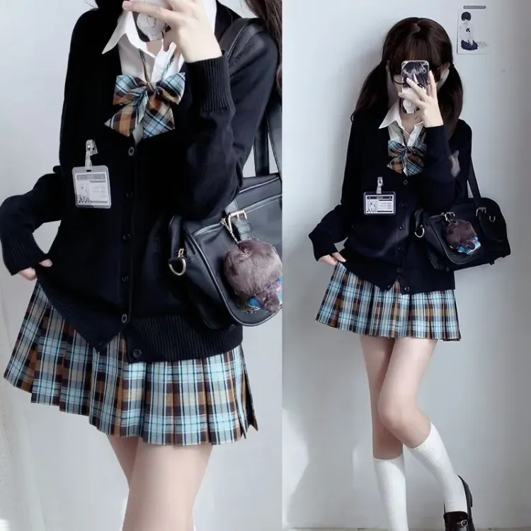 Dreamy Клетчатая Юбка + Черный Кардиган + Галстук-бабочка