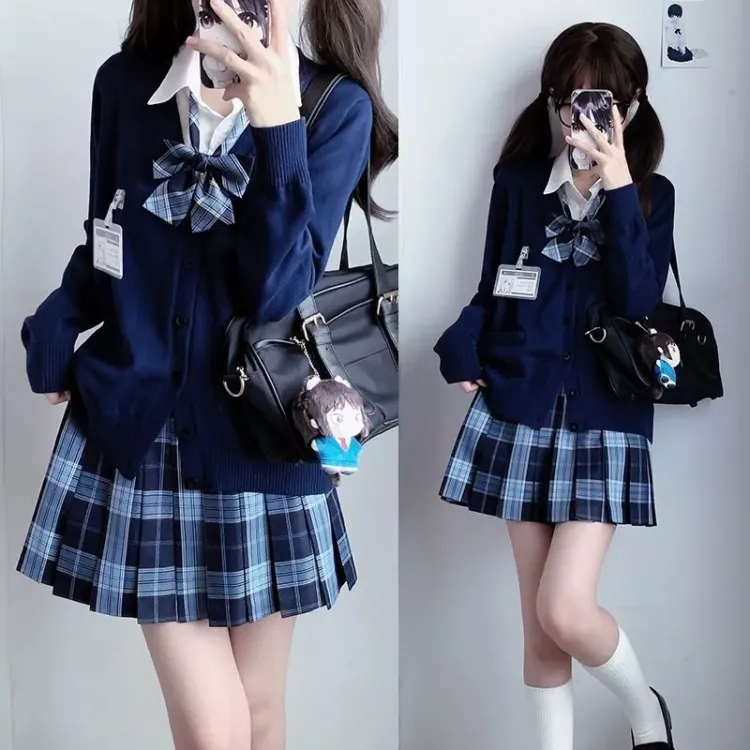 Солнечный день, клетчатая юбка, темно-синий кардиган, галстук-бабочка