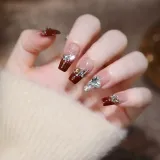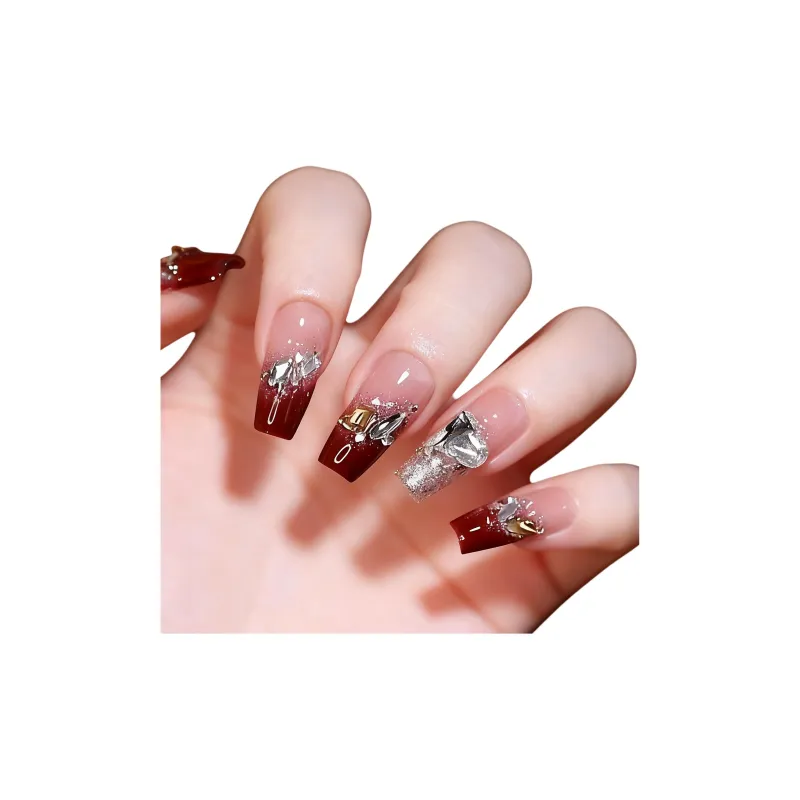 OUYUJI Ручная работа Фальшивые ногти Художественные ленты MID Длина Квадратный и Круглый Бордовый Смоки Стразы Украшенный