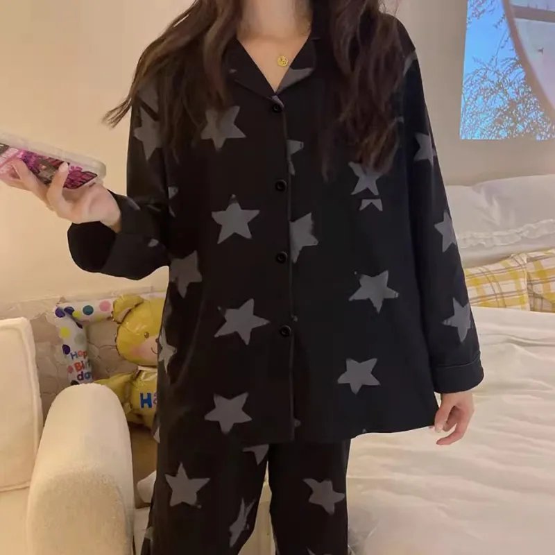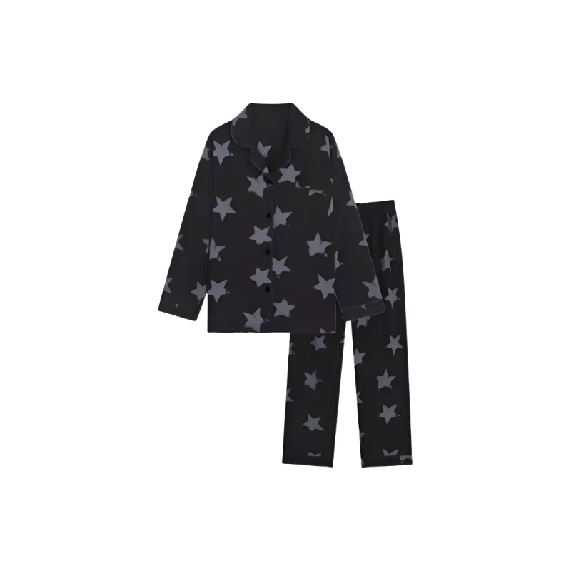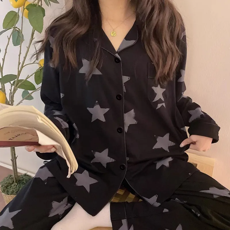 PAOPAOXIANJING Длинный рукав Пижама Черный Звезды Женские Пижамные комплекты