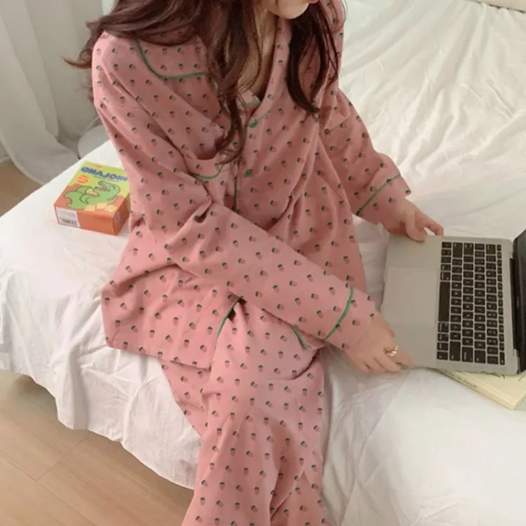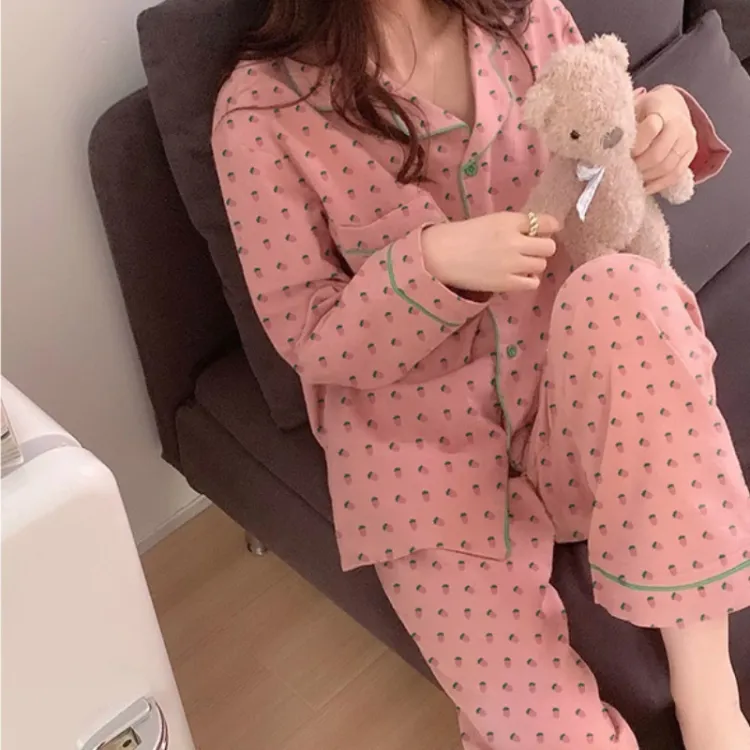 PAOPAOXIANJING Розовый Клубничный Пижама [Длинный рукав] Брюки Женские Пижамные комплекты