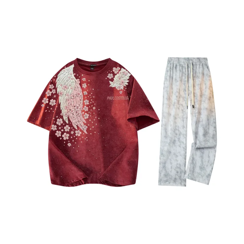 Комплект:[Одежда Комплекты] Бордовая футболка + белые тай-дай повседневные штаны