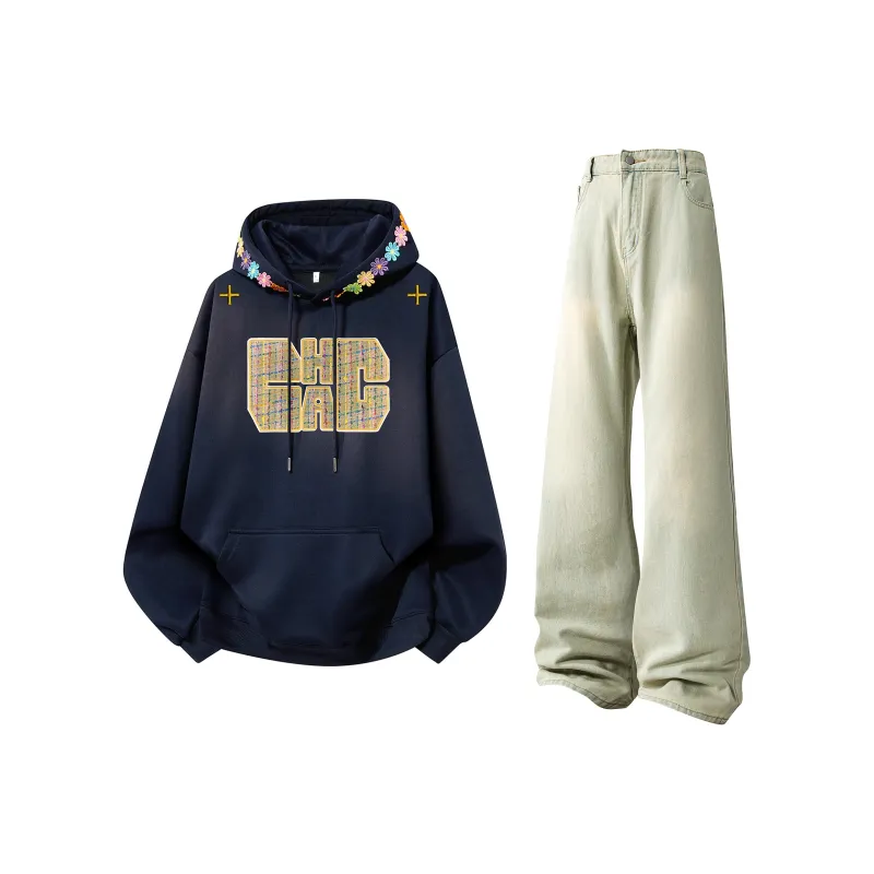 Комплект:Темно-синий синий свитшот + желтые грязные джинсы