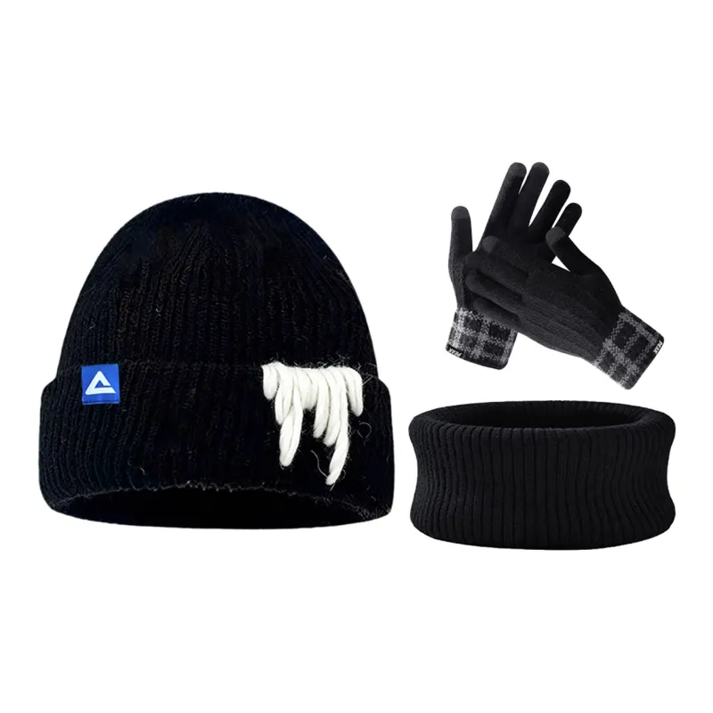 Стиль:Черная теплая шапка + черные перчатки из пряжи + черный шарф