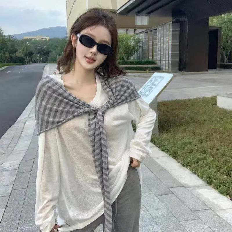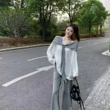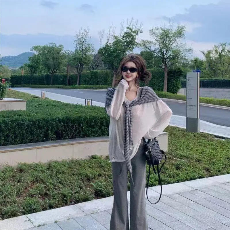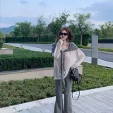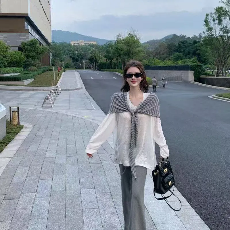 Комплект:Белая накидка + полосатая шаль + серые штаны