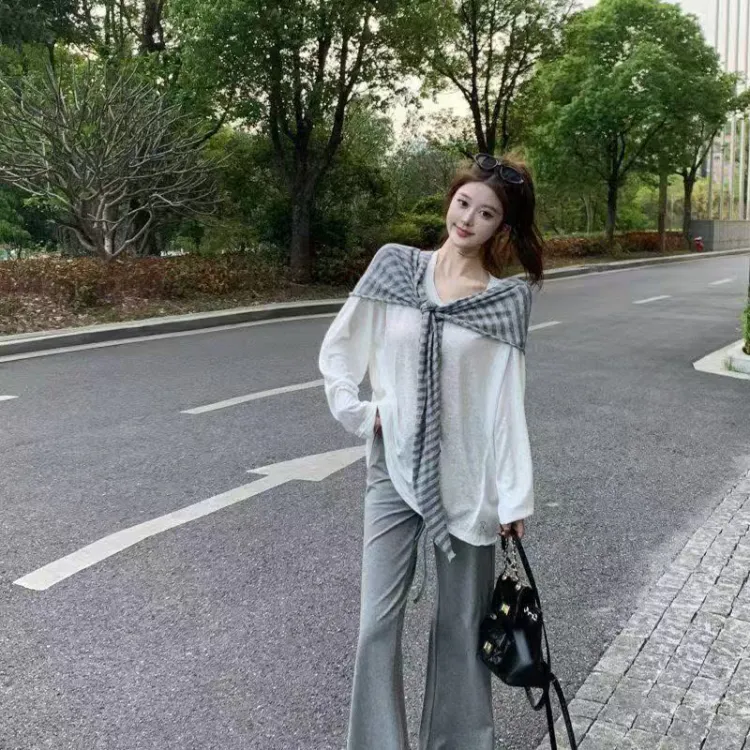 Белая накидка + полосатая шаль + серые штаны