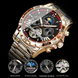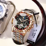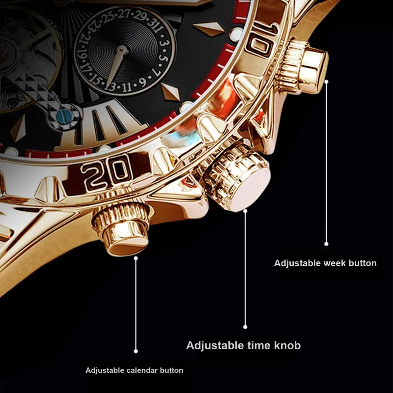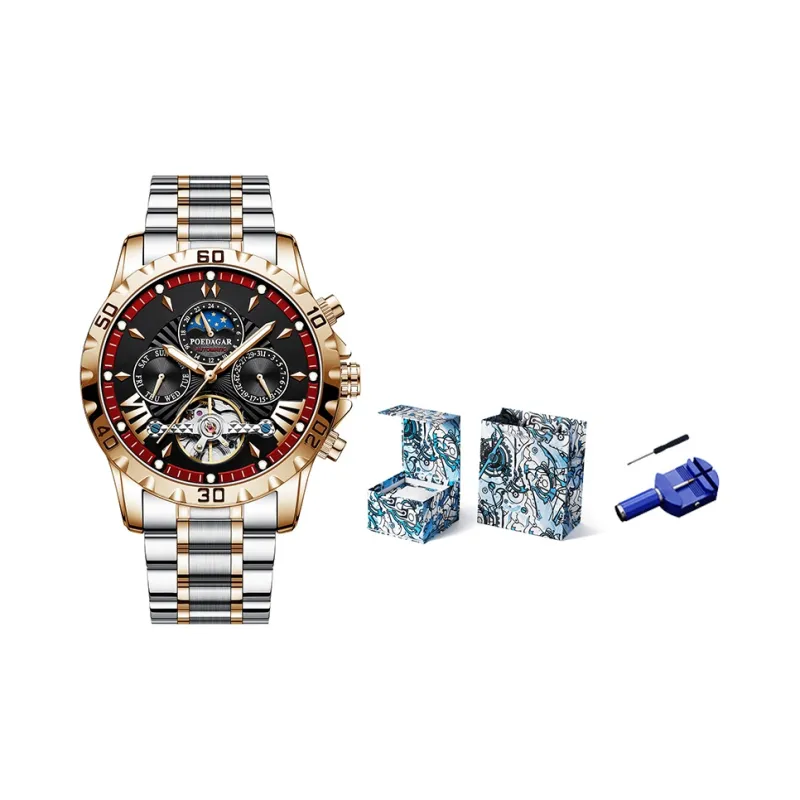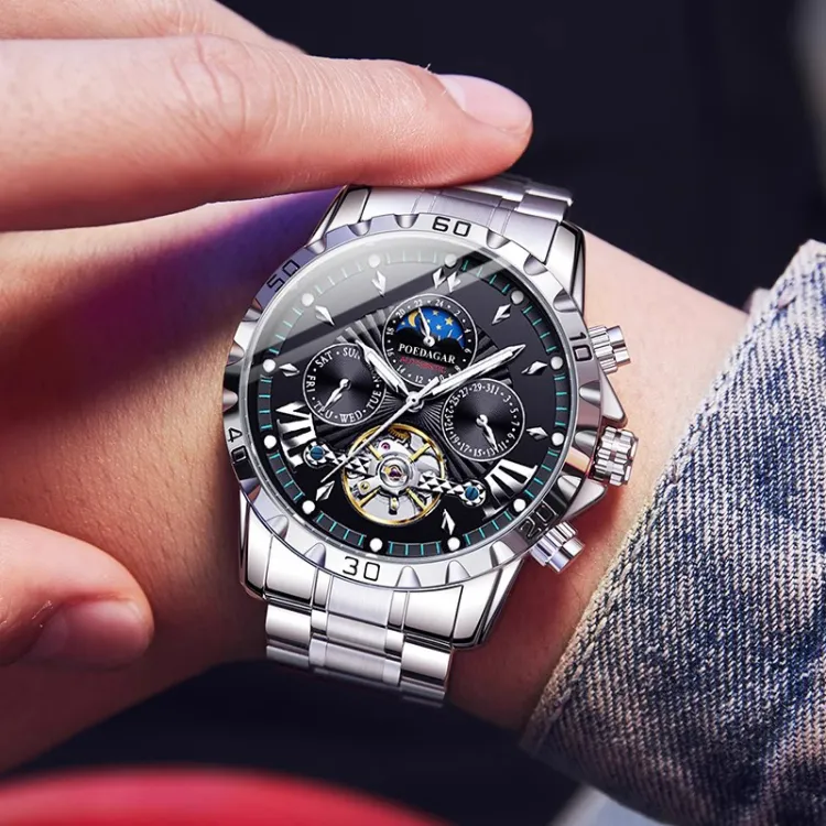 POEDAGAR Автоматический Механический Механизм Нержавеющая Сталь Ремешок Часы Мужские Черный Циферблат