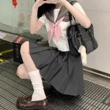 Серый воротник, розовый топ с короткими рукавами и тремя пуговицами + дымчато-розовый топ с арочным узором + темно-серая короткая юбка + белые носки до середины икры