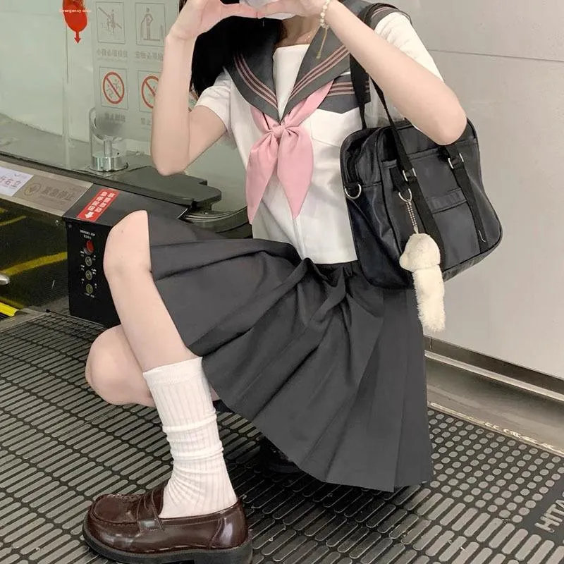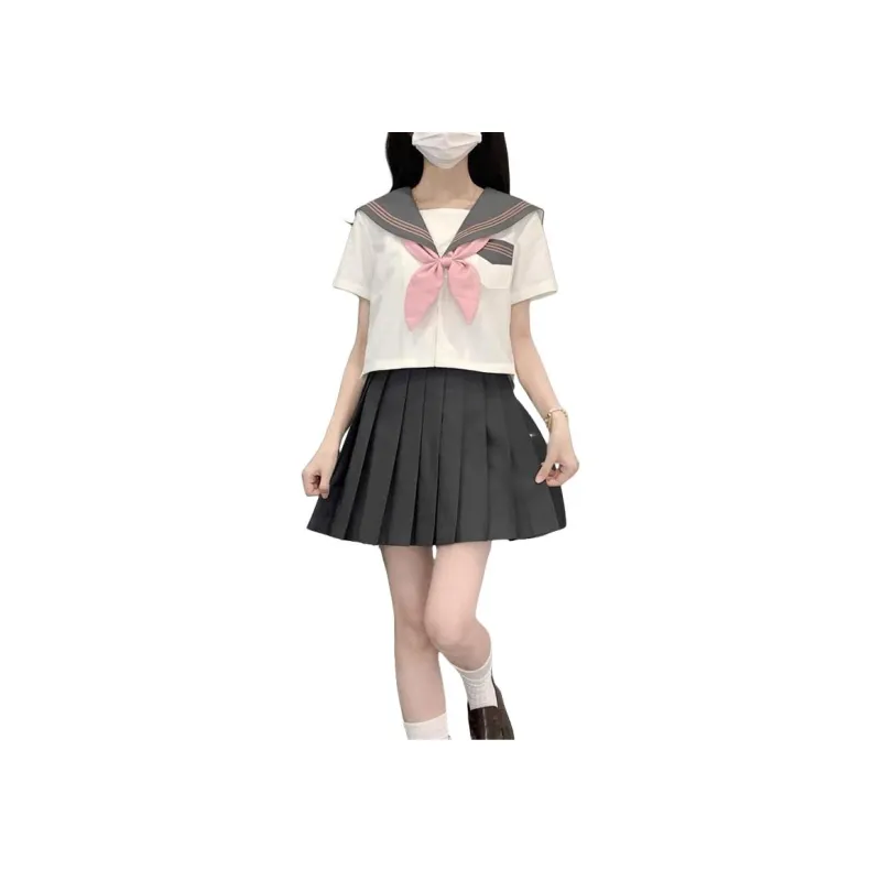 Комплект:Серый воротник, розовый топ с короткими рукавами и тремя пуговицами + дымчато-розовый топ с арочным узором + темно-серая короткая юбка + белые носки до середины икры