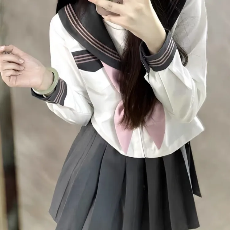Серый воротник, розовый топ с длинными рукавами + дымчато-розовый топ с арочным узором + темно-серая короткая юбка + белые носки до середины икры (включено)