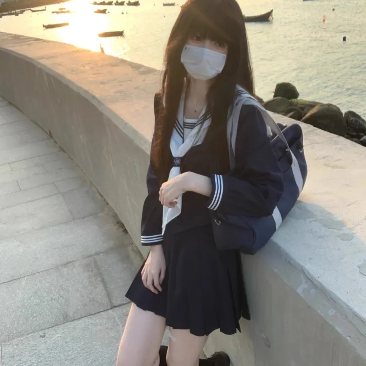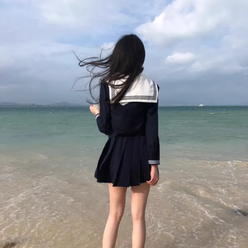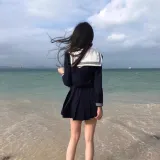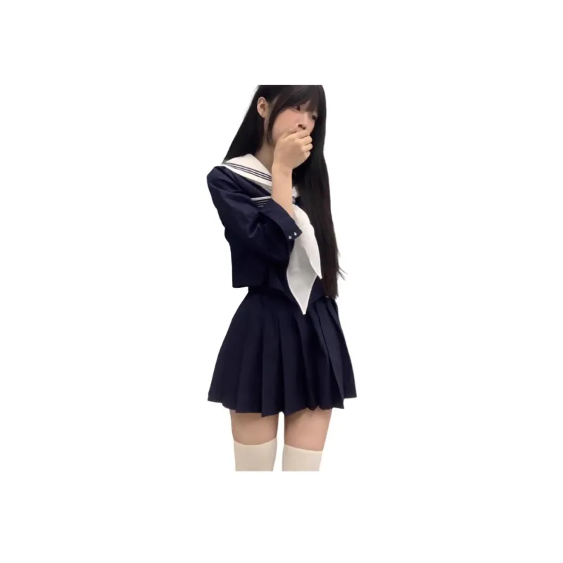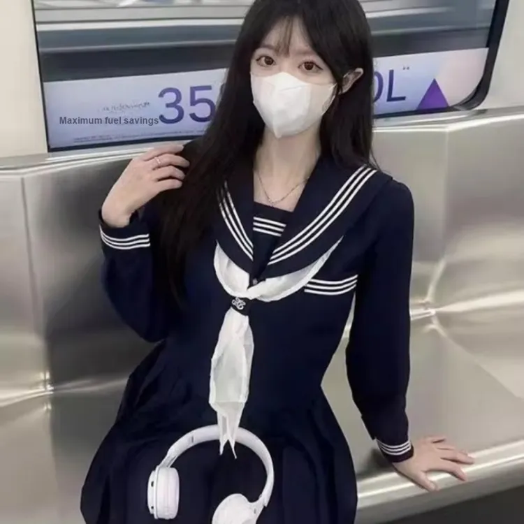 Комплект:Белый воротник Длинный рукав Поло + Белый воротник Шарф + Темно-синий с пуговицей + Темно-синий Юбка А-силуэта