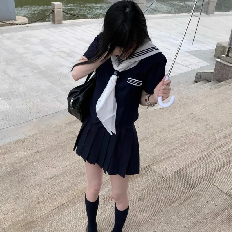 Белый воротник, короткий рукав + белый воротник, шарф + темно-синий, кольцо, пуговица + темно-синий, юбка A-образной