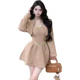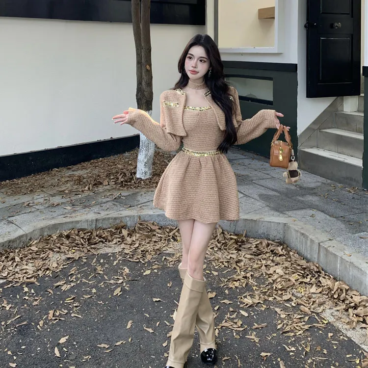 Комплект:Кофе Пальто + Топ на бретелях + Юбка