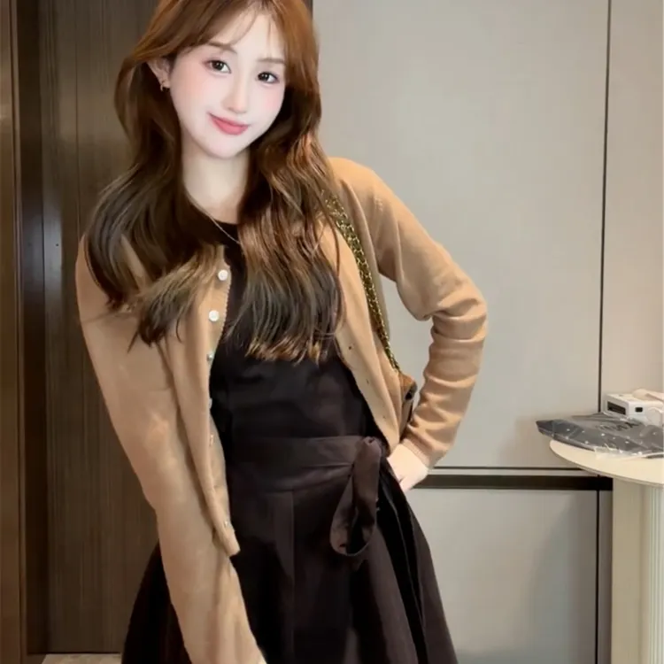 Кофейный кардиган + черное платье