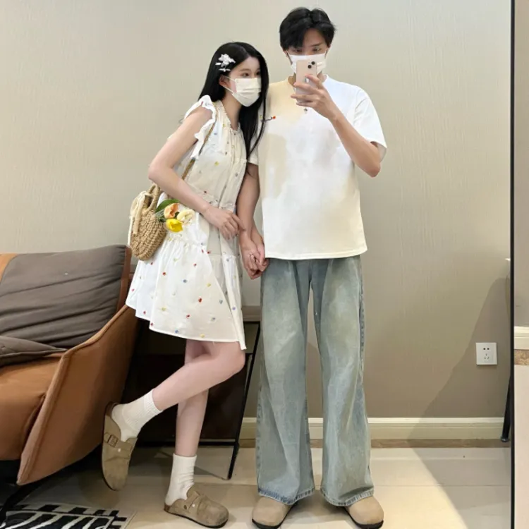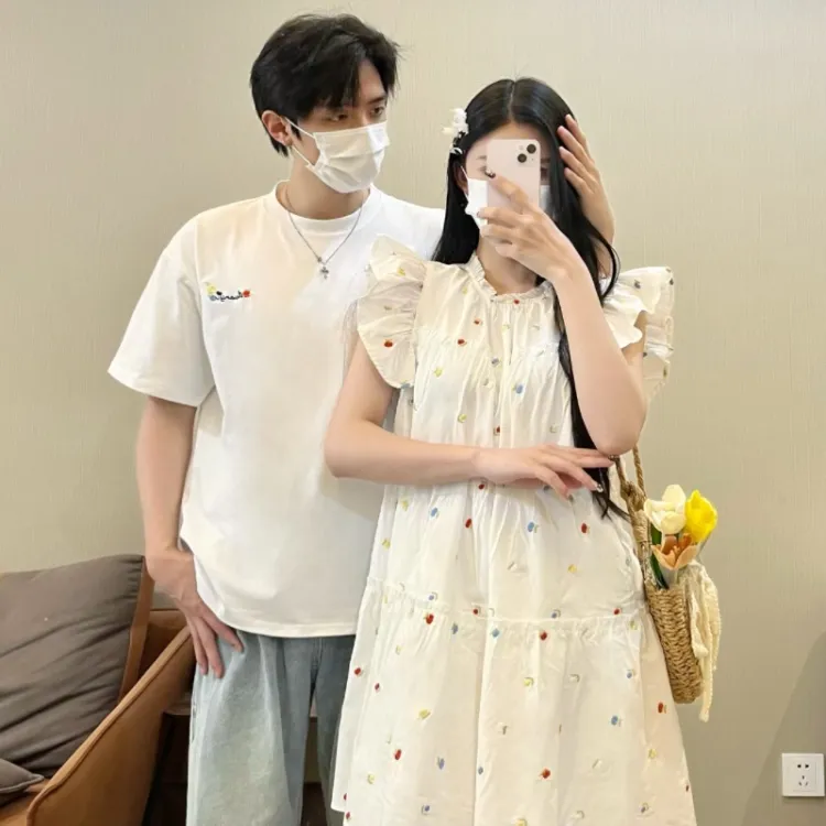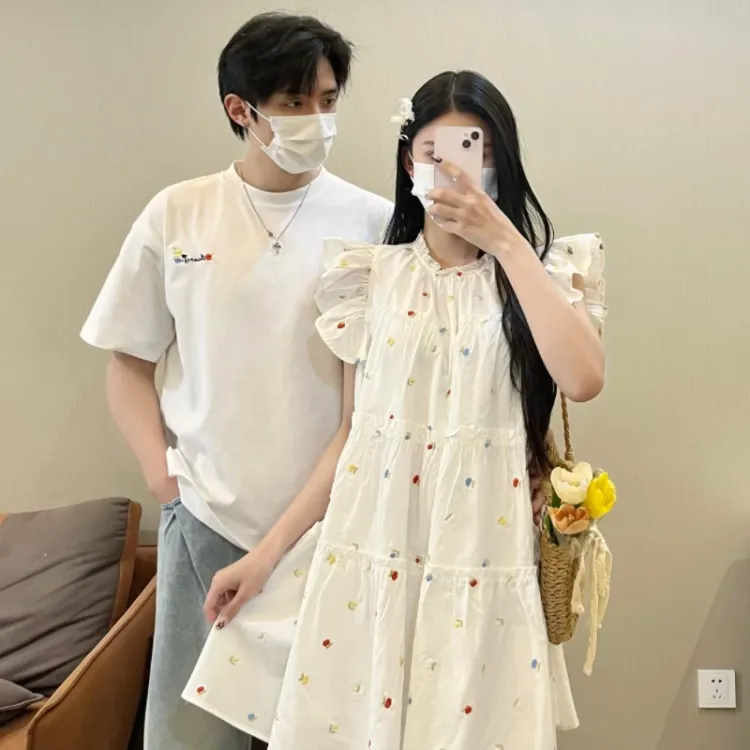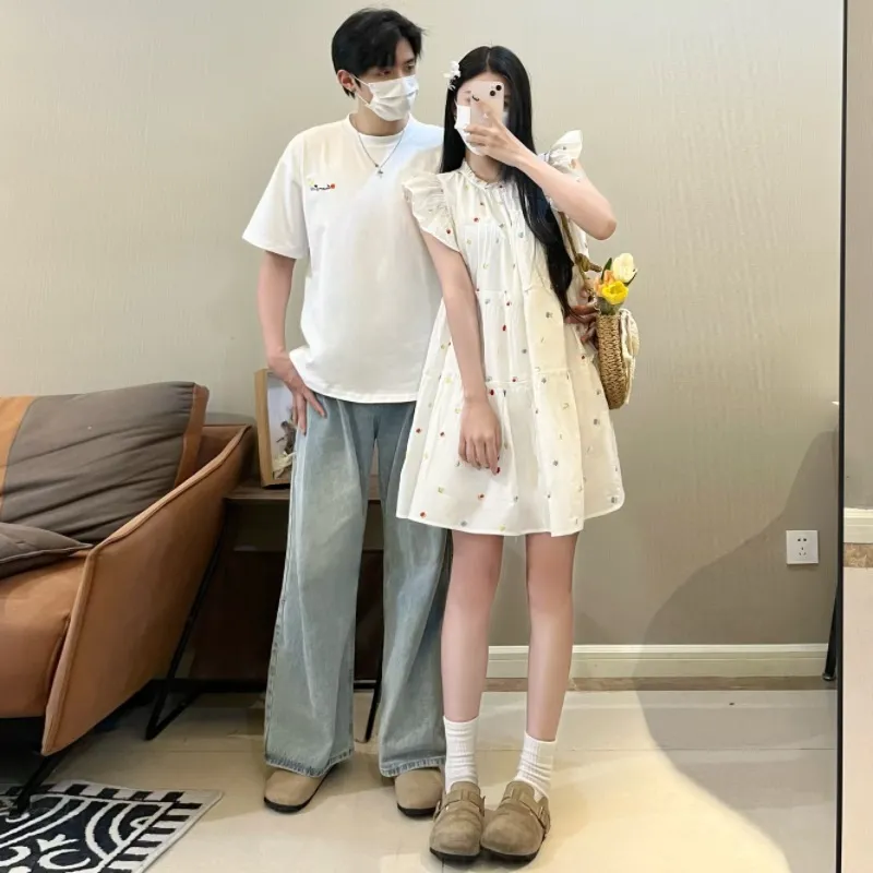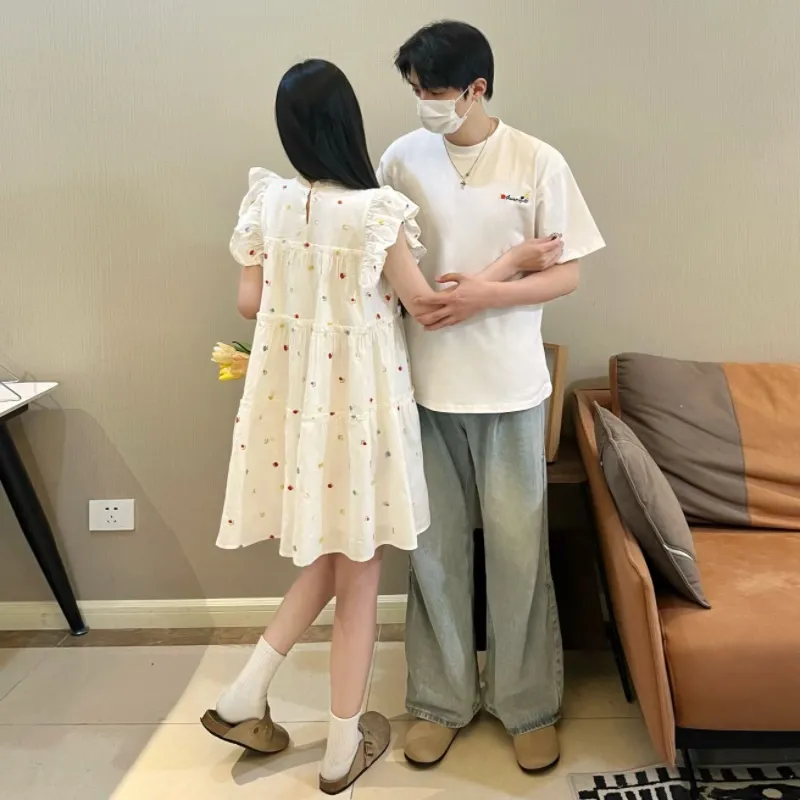 QYPRF Белая одежда для пары Мужская футболка + Женское платье Женские парные комплекты