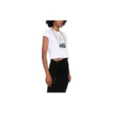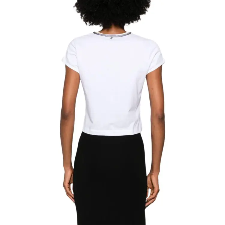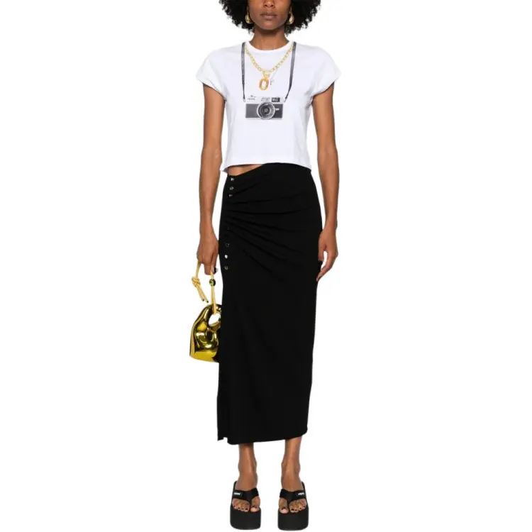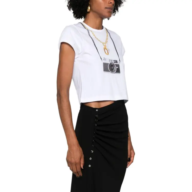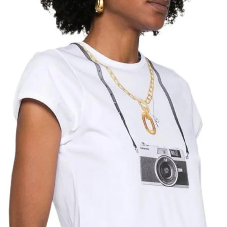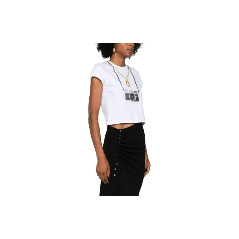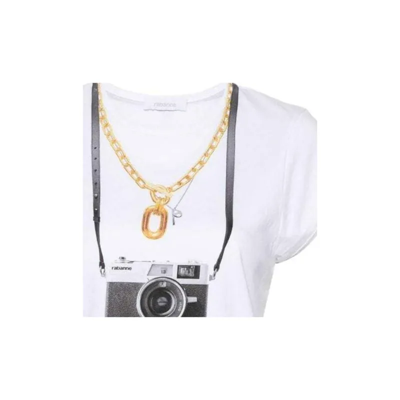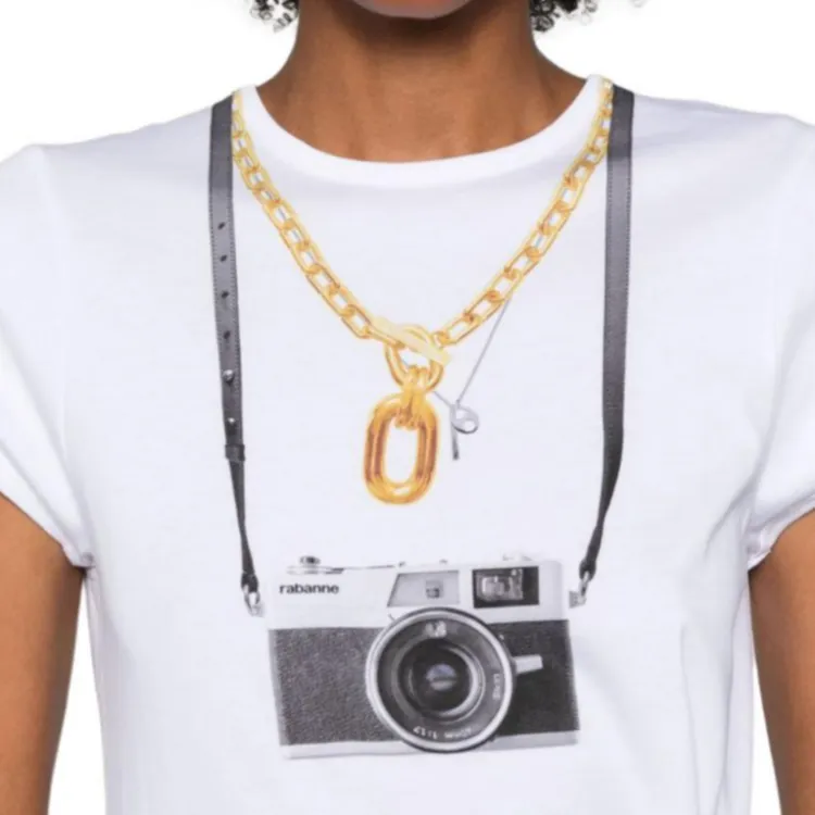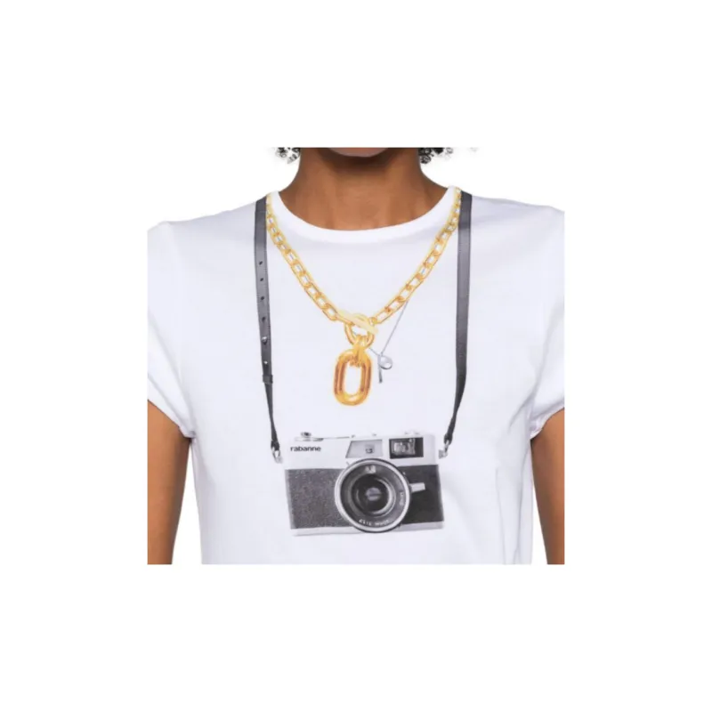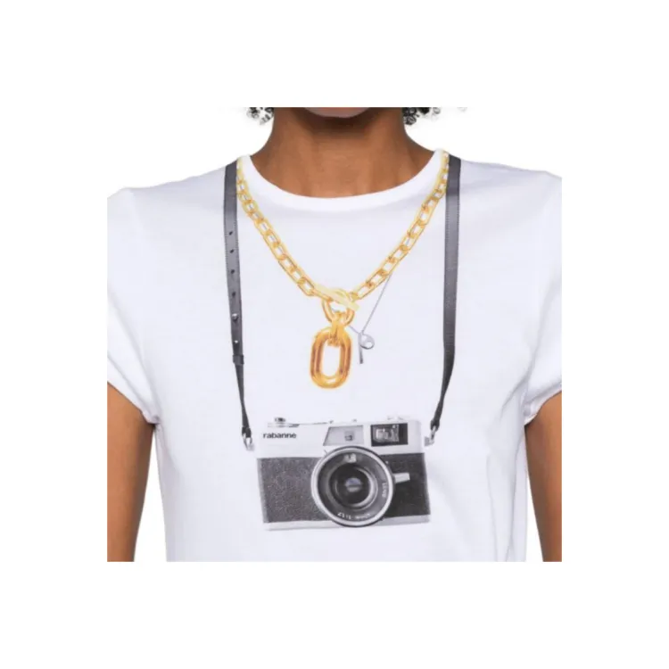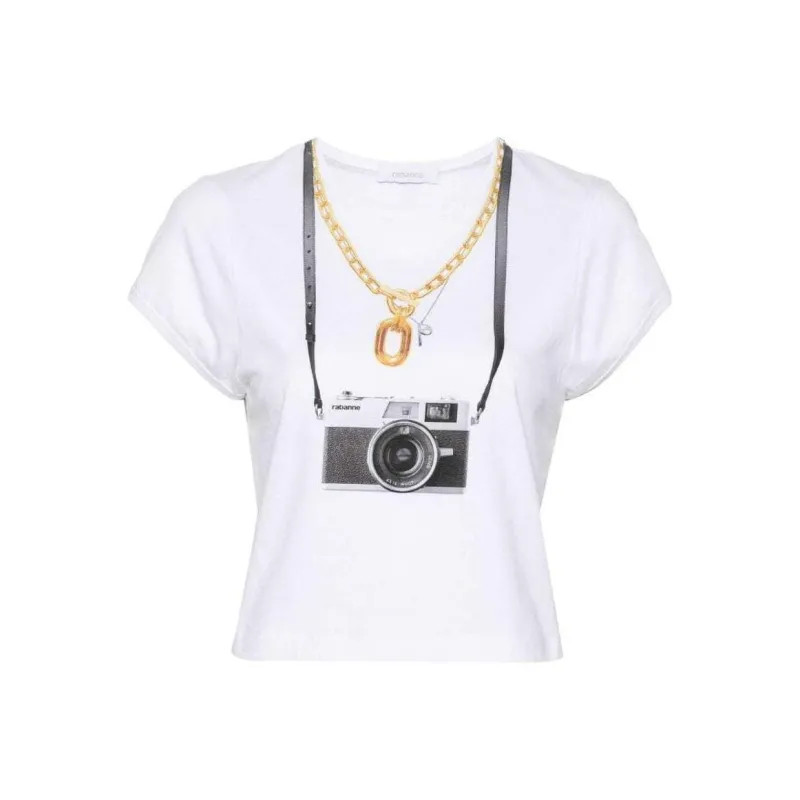 Paco Rabanne Фотография С принтом Круглый вырез Облегающий крой Короткий рукав Т-рубашка Женская Белая