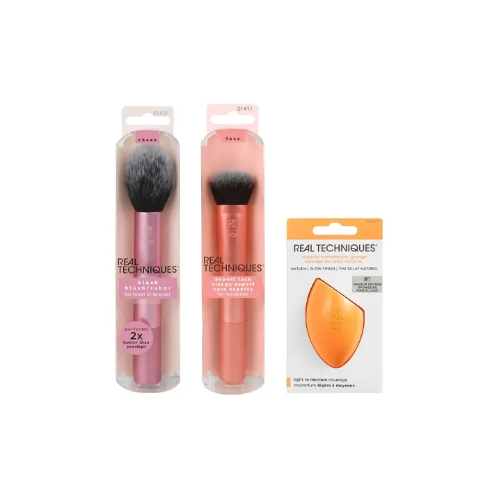 Real Techniques Набор для макияжа из трех предметов щетка для основы + кисть для румян + губка для макияжа