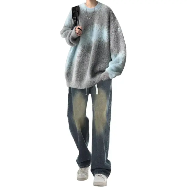 Свитер синий + белый с длинными рукавами + синие джинсы