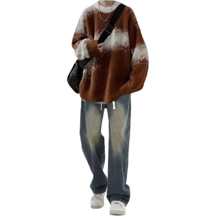 Свитер, кофе + белый, с длинными рукавами + синие джинсы