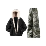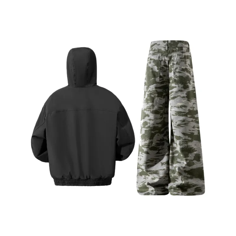 Комплект:Чёрный хлопковый пуховик + яшмовые джинсы