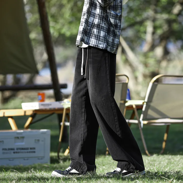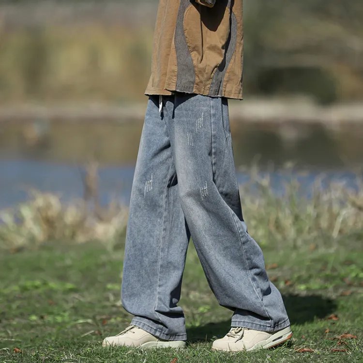 Серый топ + винтажные синие штаны