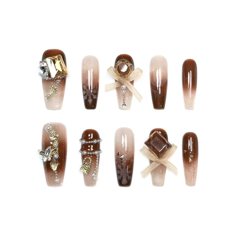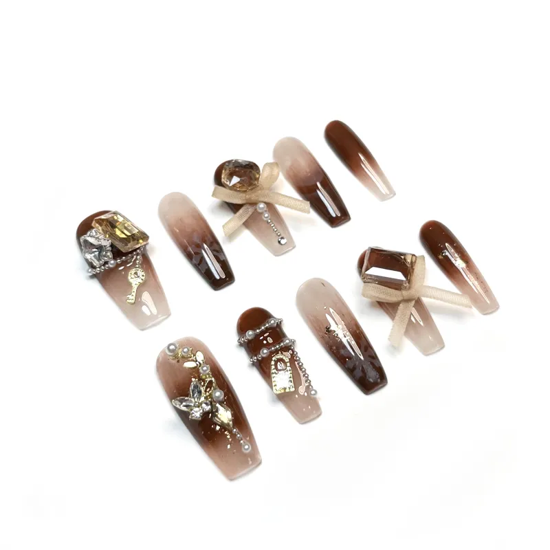 Rui Jin Бабочка Стиль Майярд False Nail MID Длина Коричневый Смужка Стразы Украшенный 26 мм