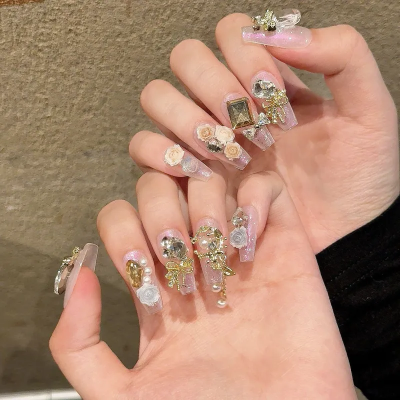 Rui Jin Роскошь Кристальный Осветляющий Кокетливый стиль False Nail MID Длина Многоцветный Градиентный Стразы Украшенный 24 мм