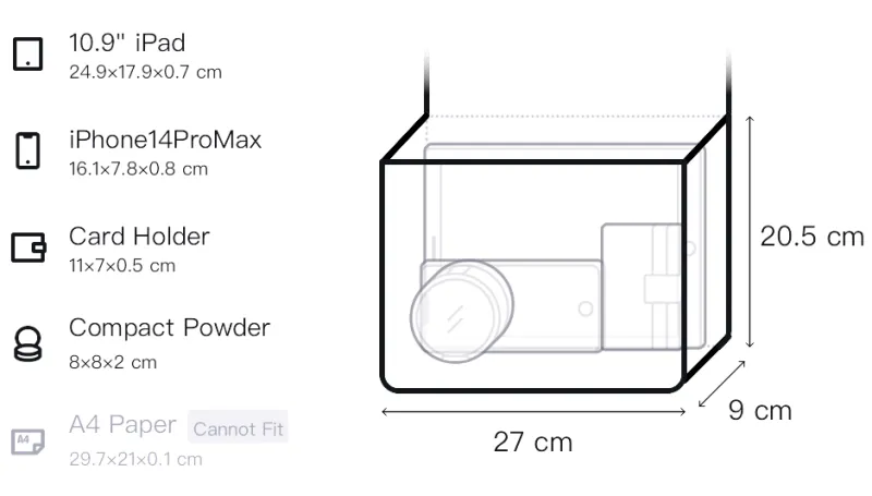 Длина (размер в длину): 27 см, Ширина корпуса: 9-13 см, Длина корпуса: 20,5 см