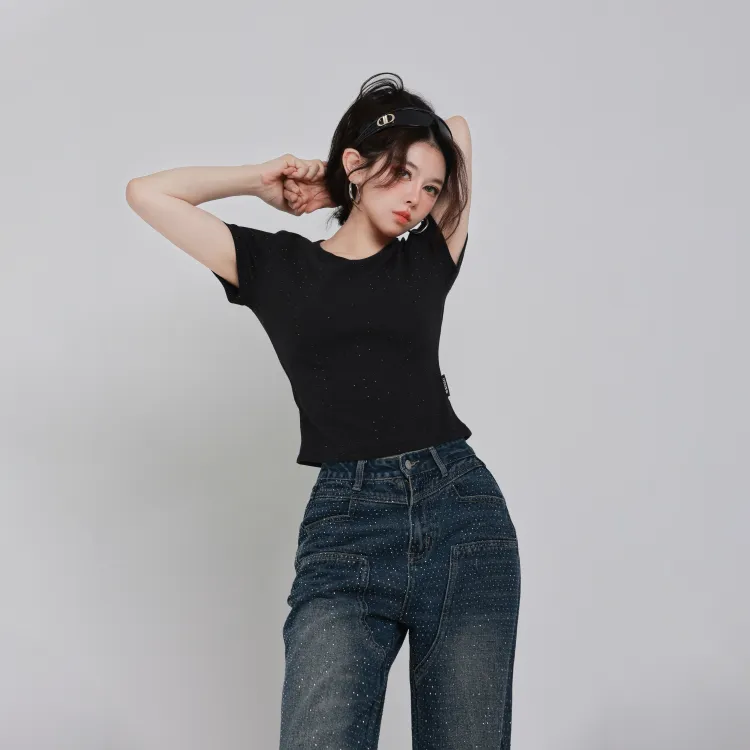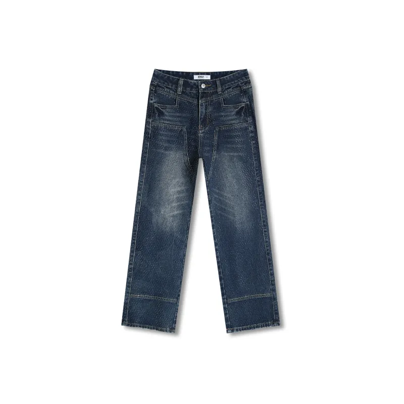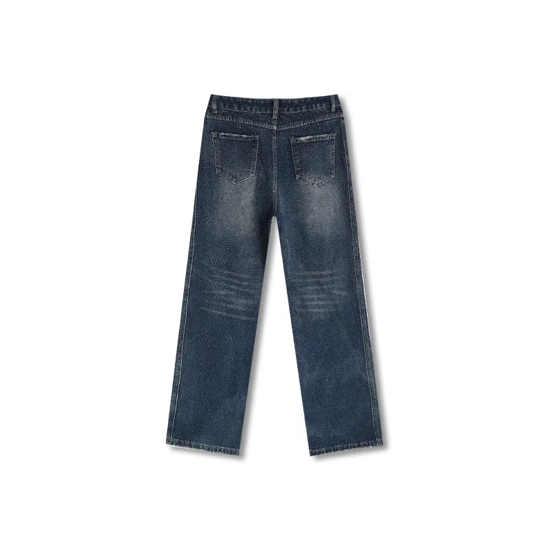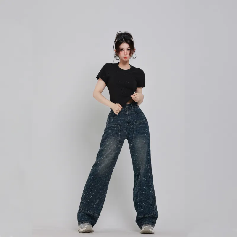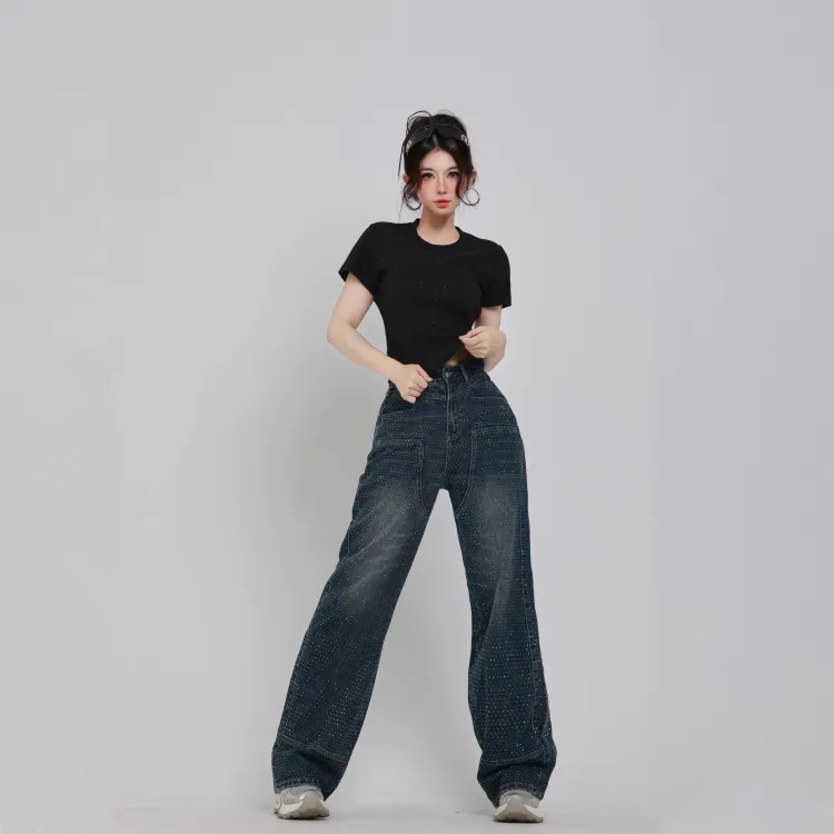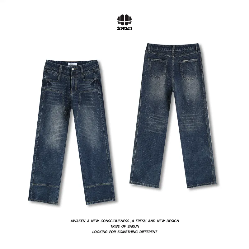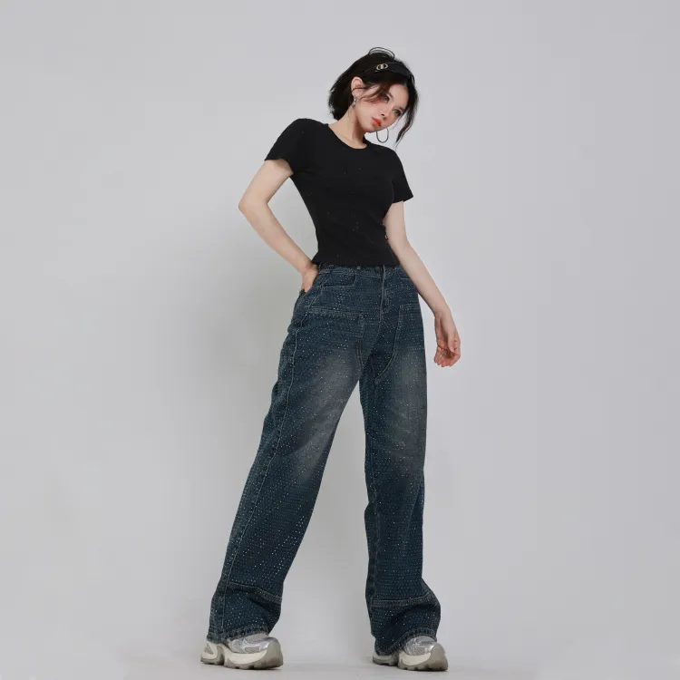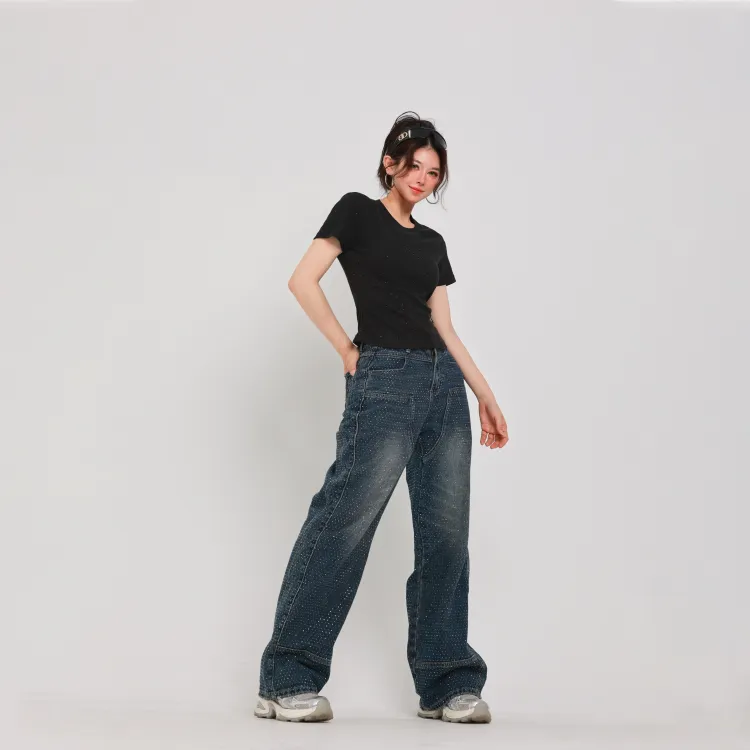 SAKUN Джинсы Женские Тяжелые Джинсовый Синий с Полностью Украшенными Стразами