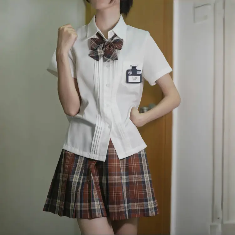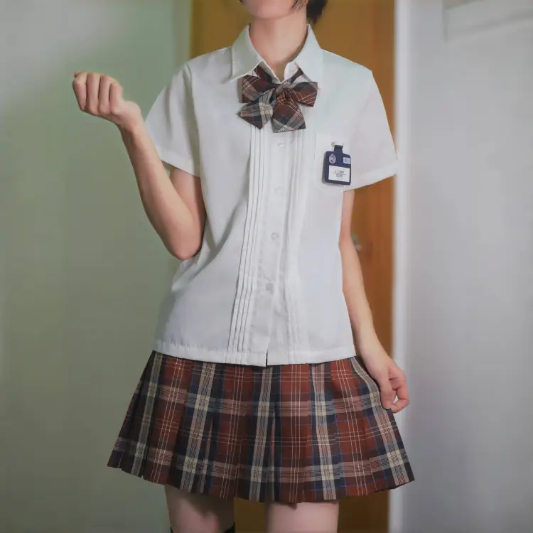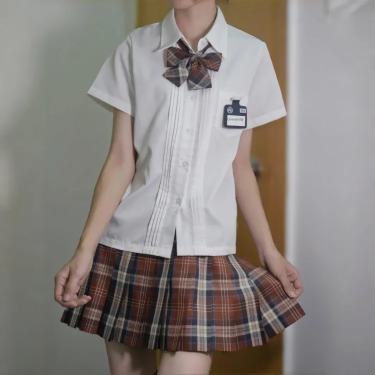 Плиссированная рубашка с коротким рукавом, белого + карамельно-коричневого цвета, с узором "каштановый обжаренный", юбка + боксерские шорты, галстуки-бабочки + новый значок на груди