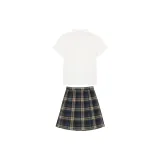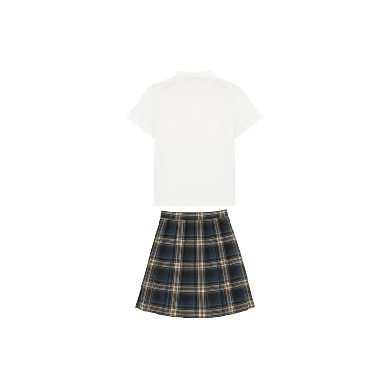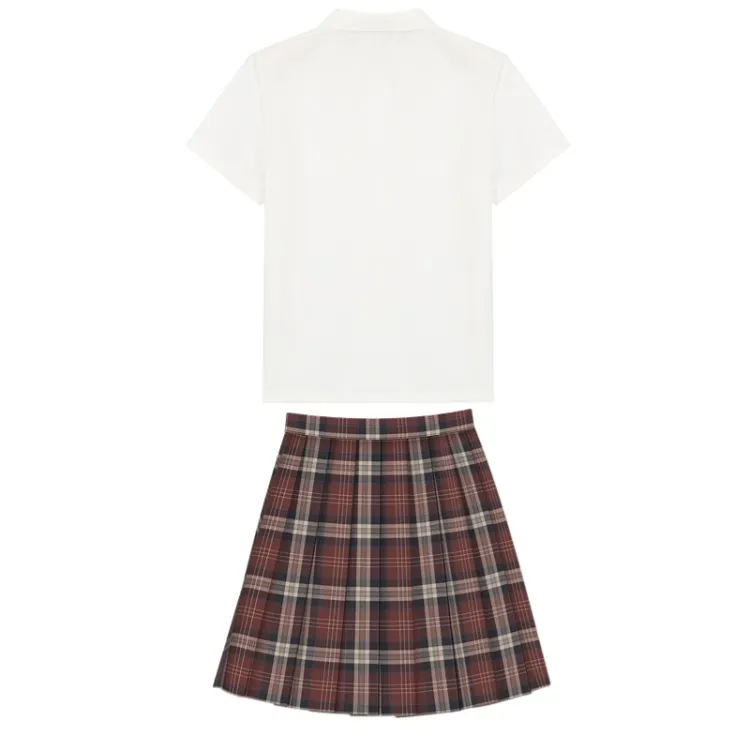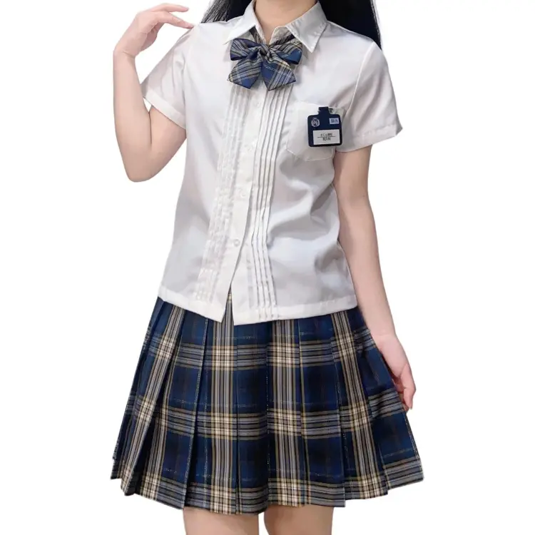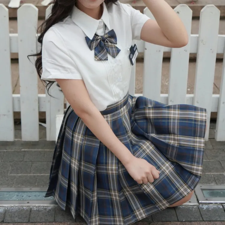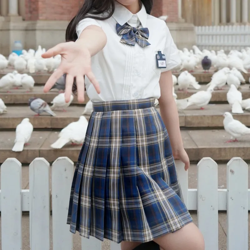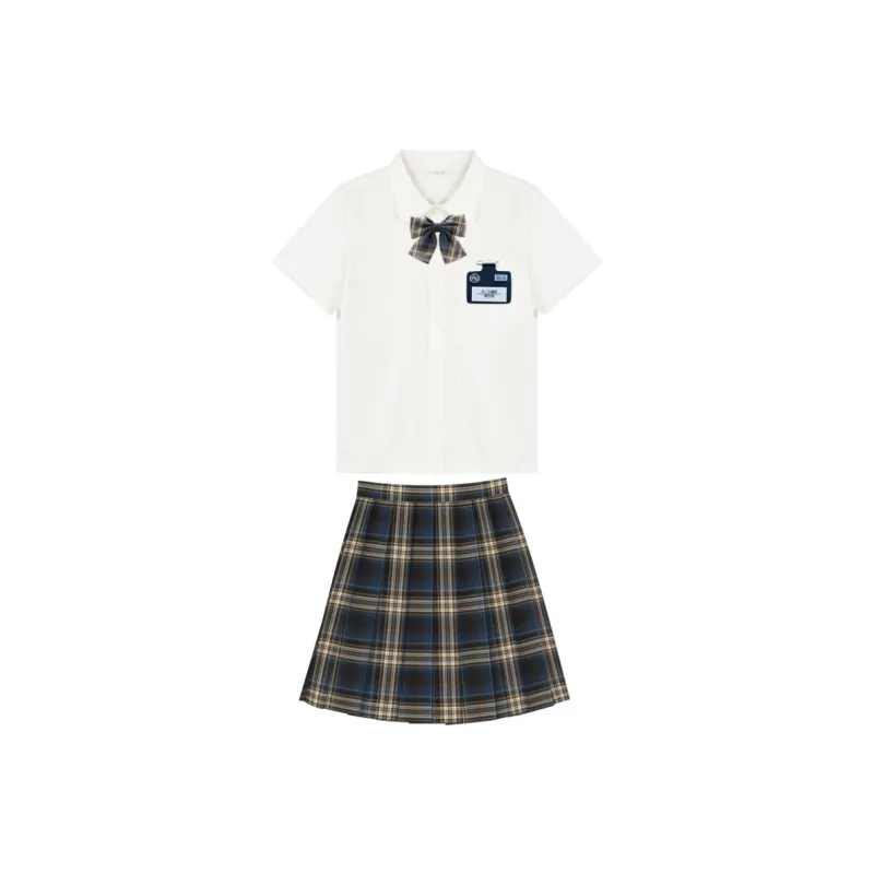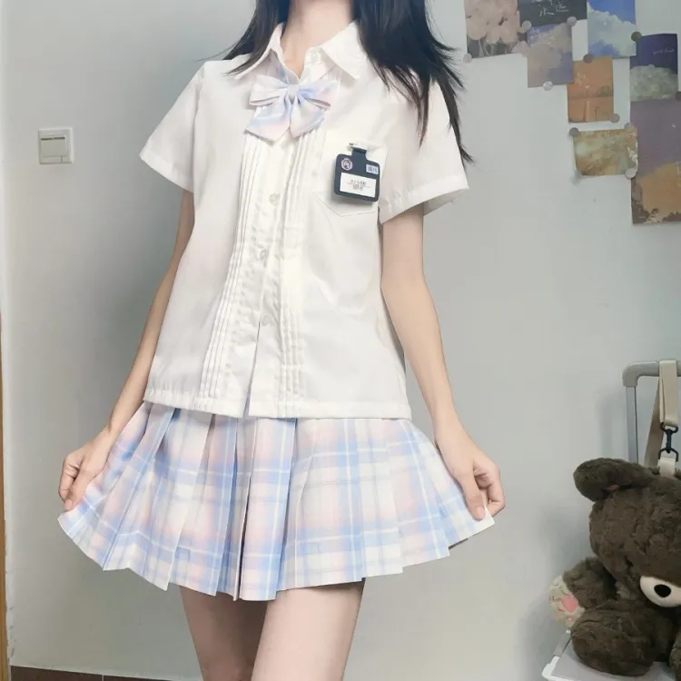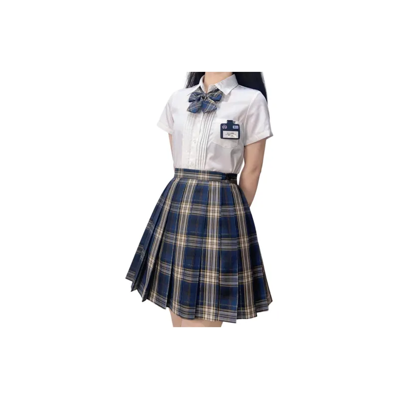 Плиссированная рубашка с коротким рукавом, белого цвета + маленькая юбка в клетку + боксерские шорты + галстуки-бабочки + новый значок на груди JK