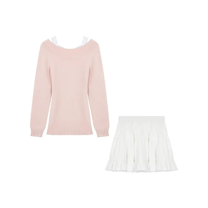 Цвет:Светло-розовый свитер с V-образным вырезом + белое кружевное нижнее белье + белая многослойная юбка + брошь в виде медведя