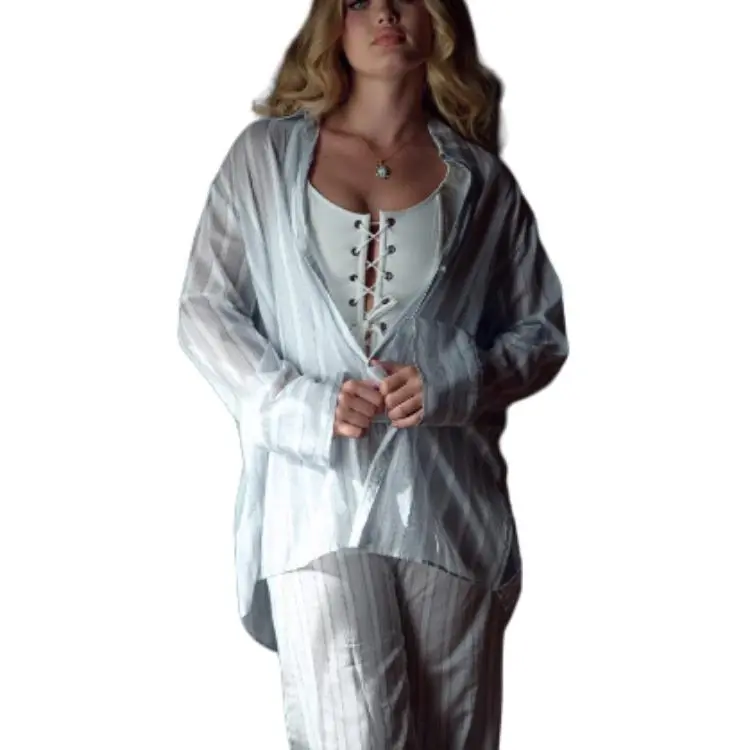 Selkie Коллекция SS24 Рубашка Женская Светло-Синяя Вертикальные Полосы Белый Чайные Футболки С Принт