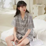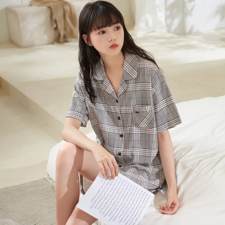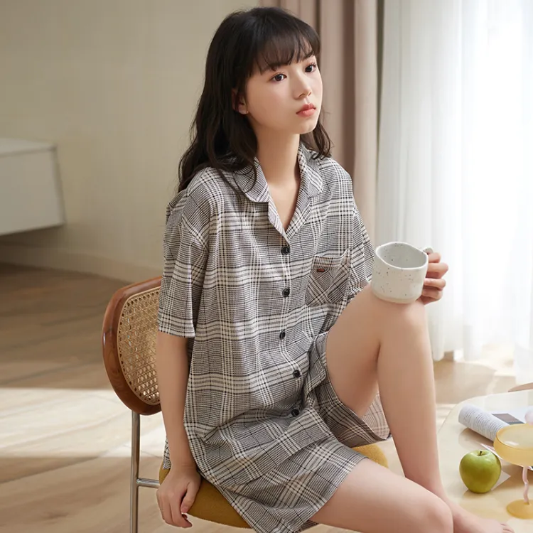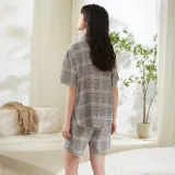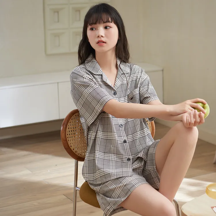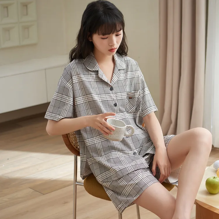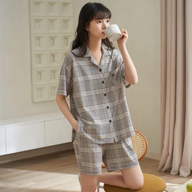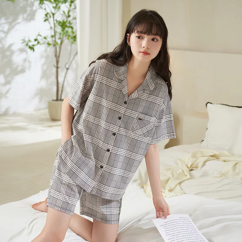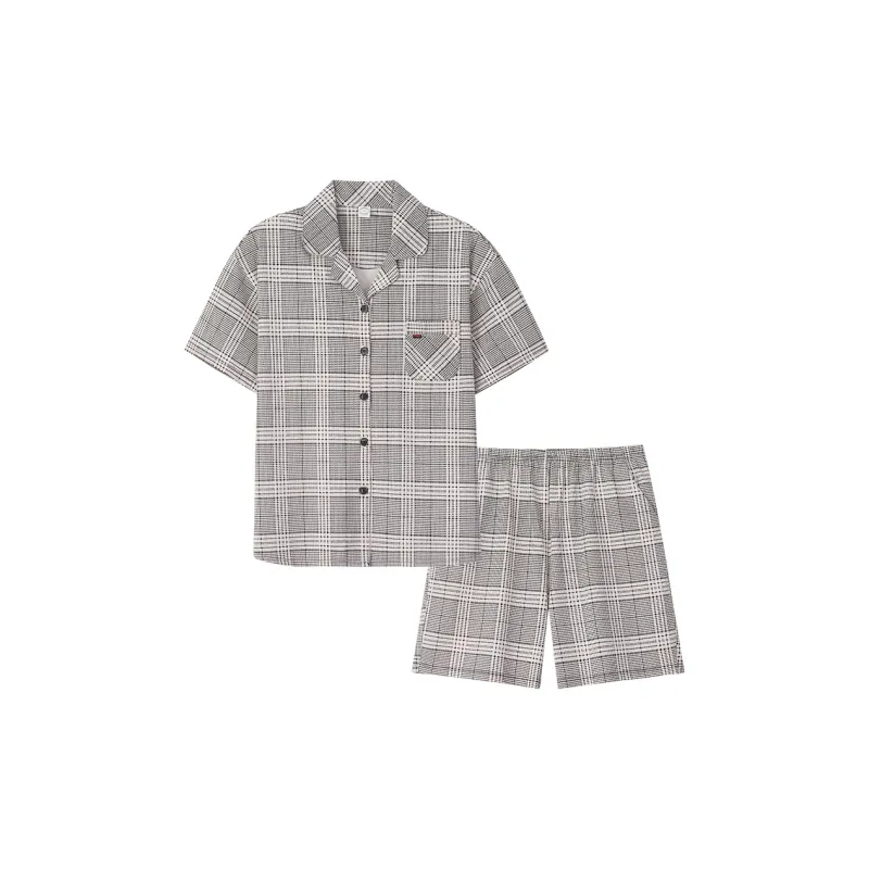 Sha Qian Пижамный комплект Летний Женский Серый Клетка