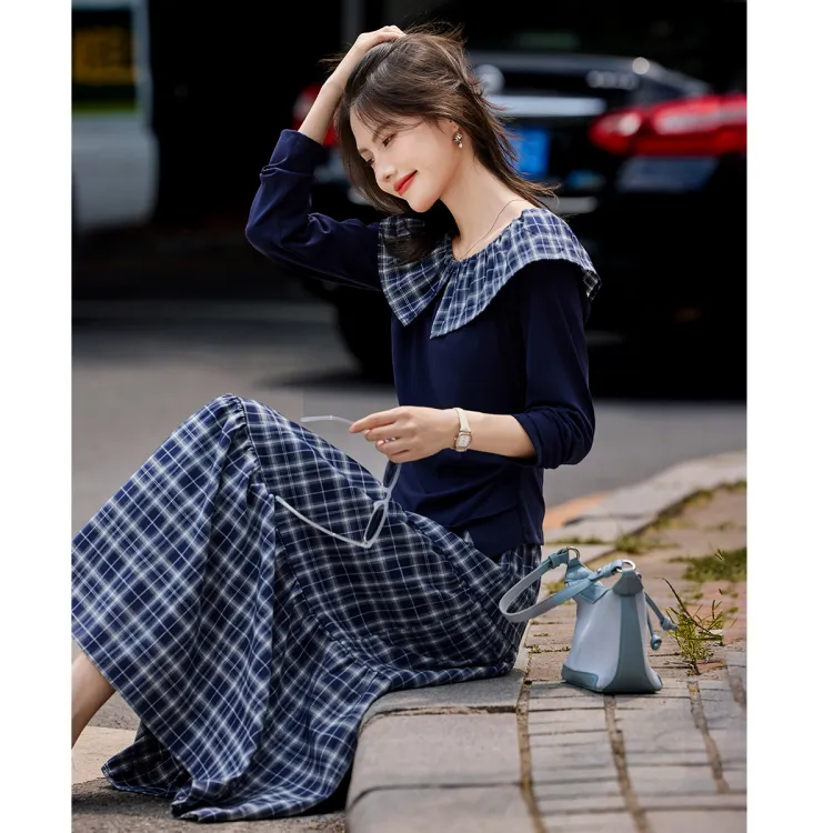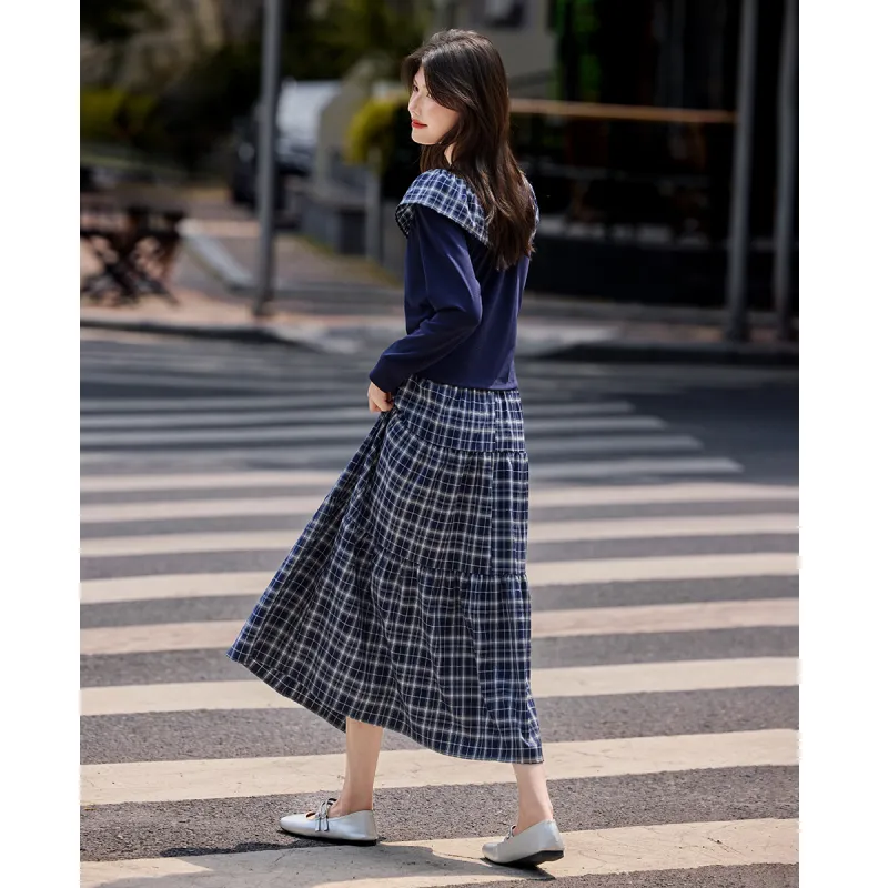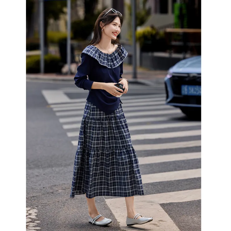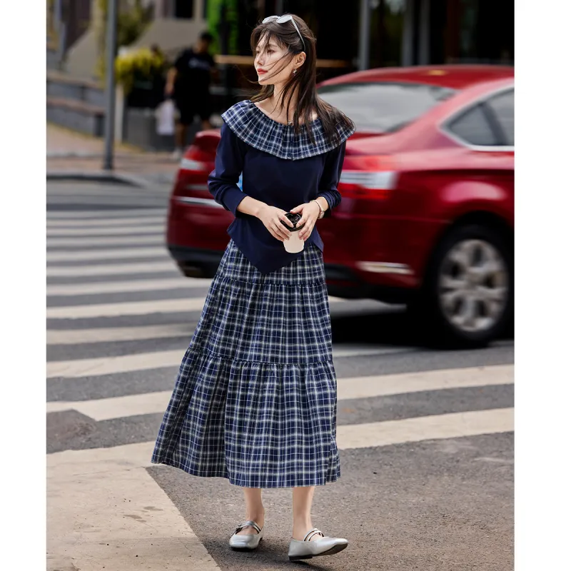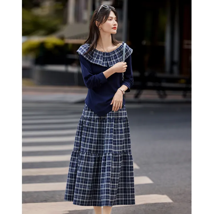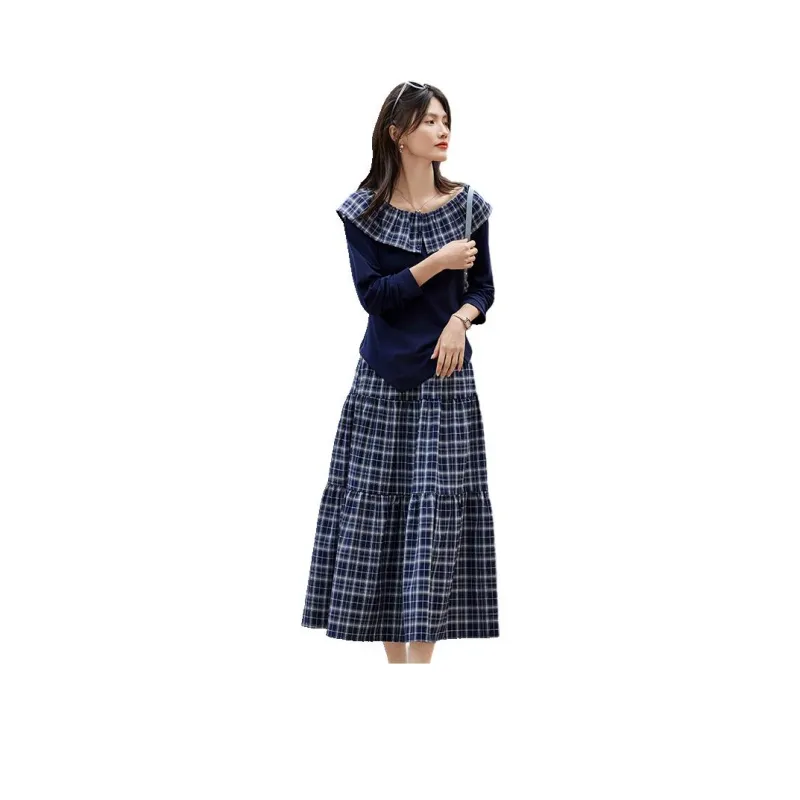 SHANGJING Темно-синий клетчатый женский комплект с юбкой