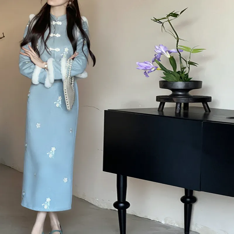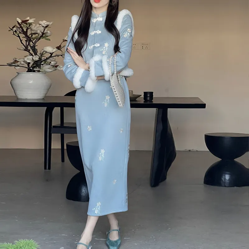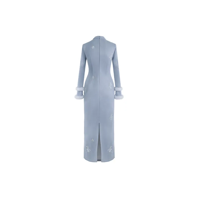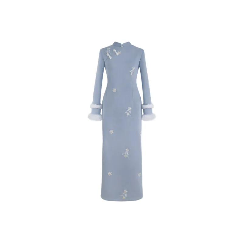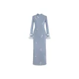 Sheep Design Длинное платье с длинными рукавами женское синее