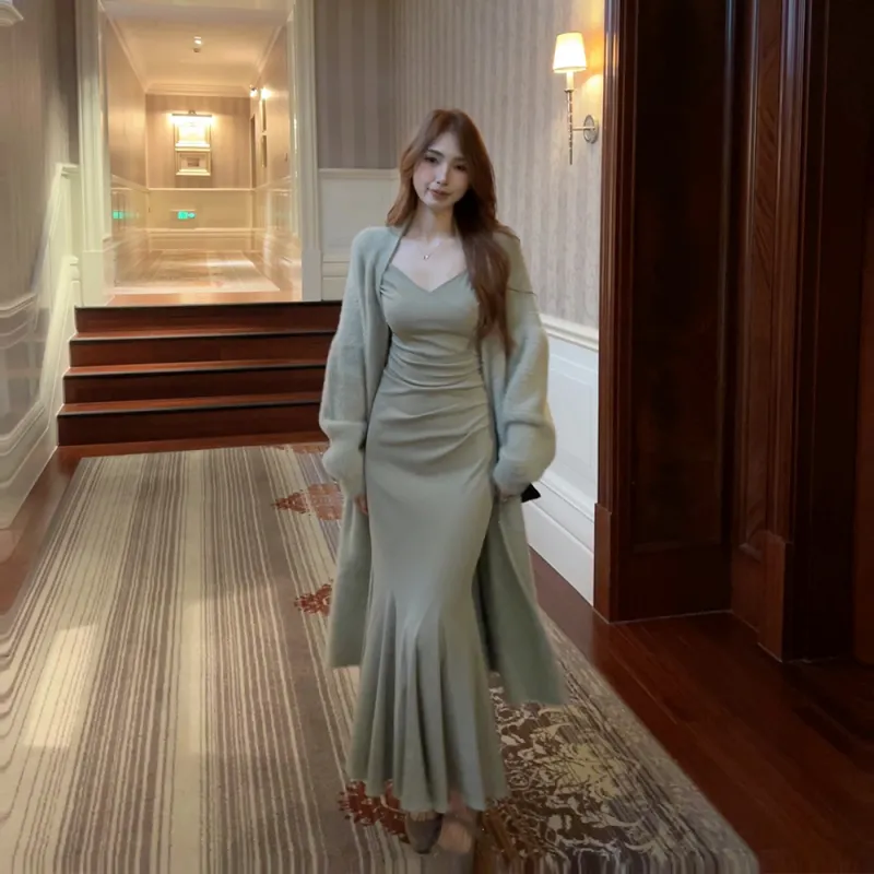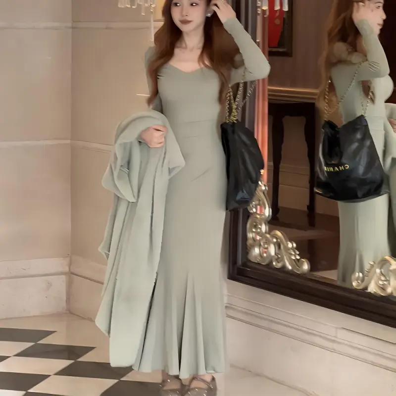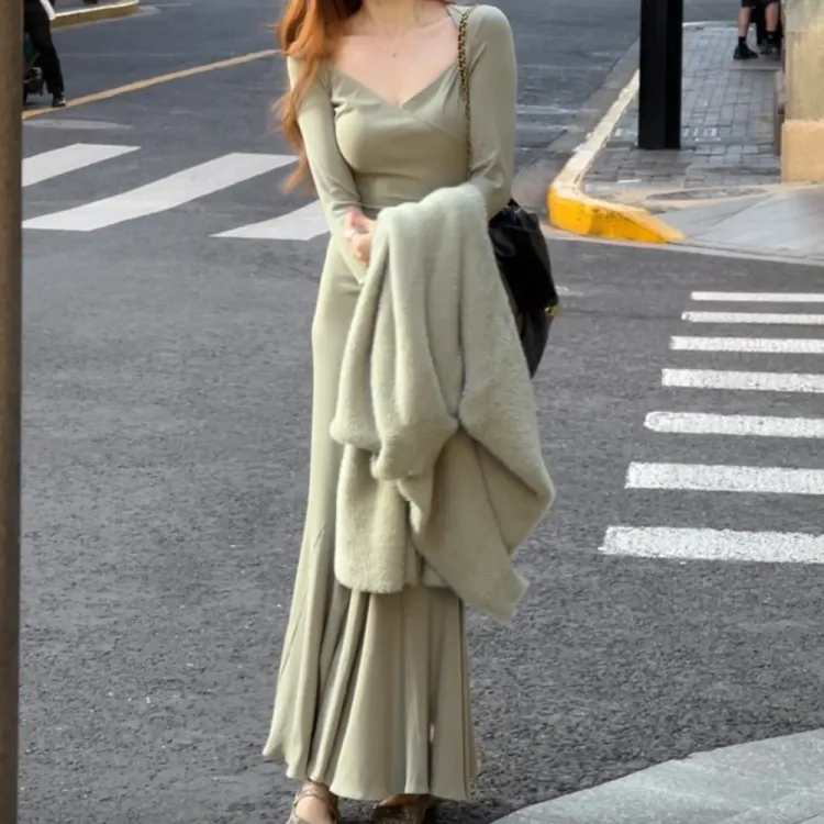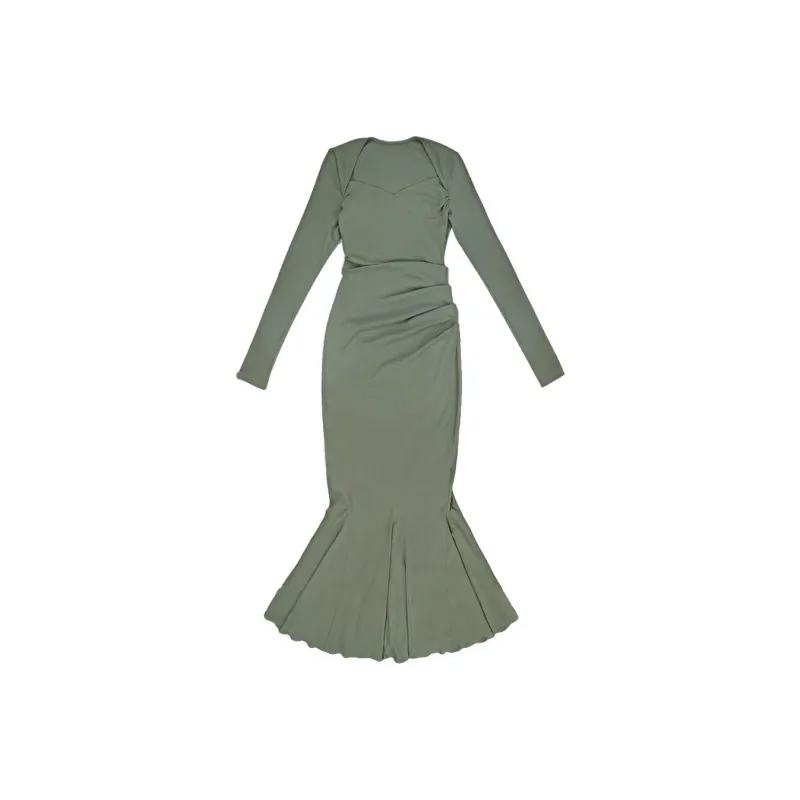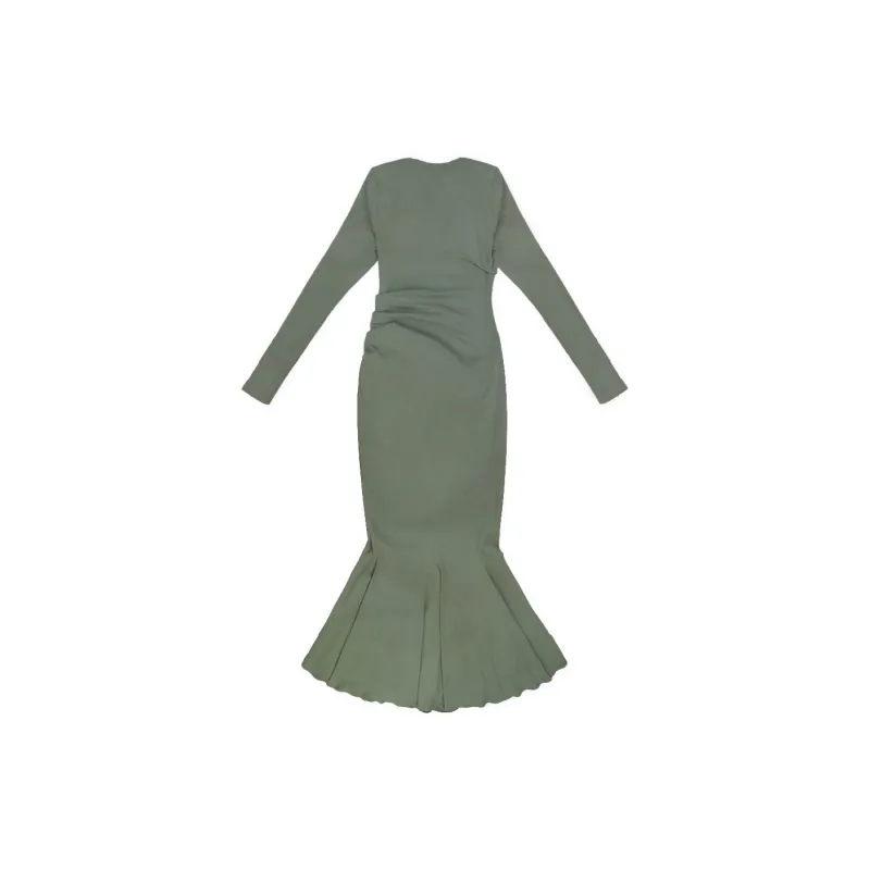 Sheep Design Длинное платье с длинными рукавами женское зеленое