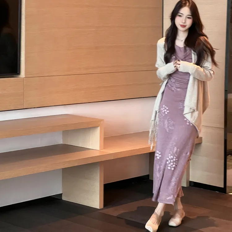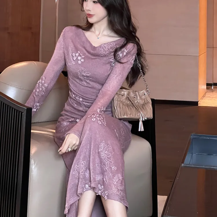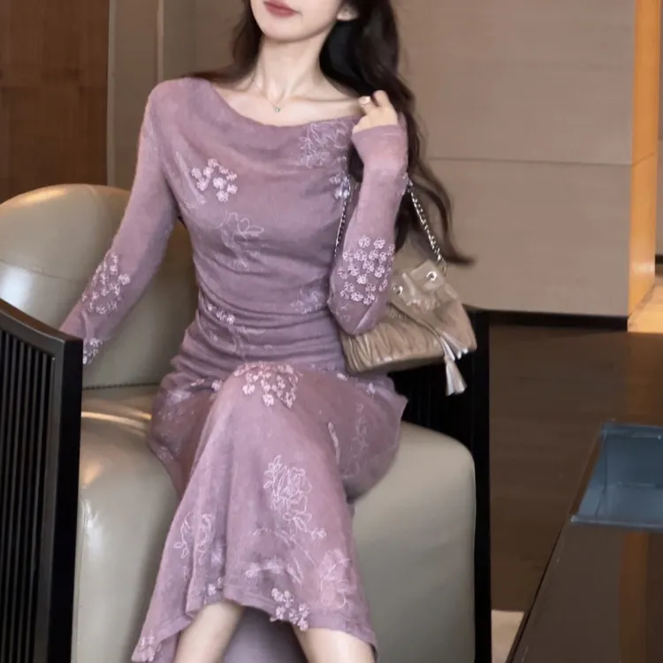 Sheep Design Длинное платье с длинными рукавами женское фиолетовое