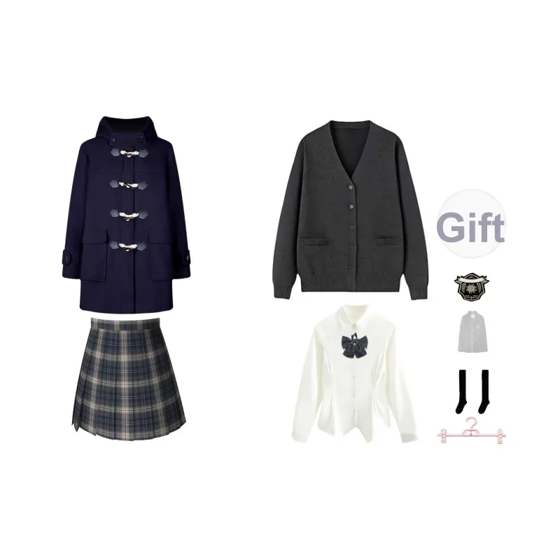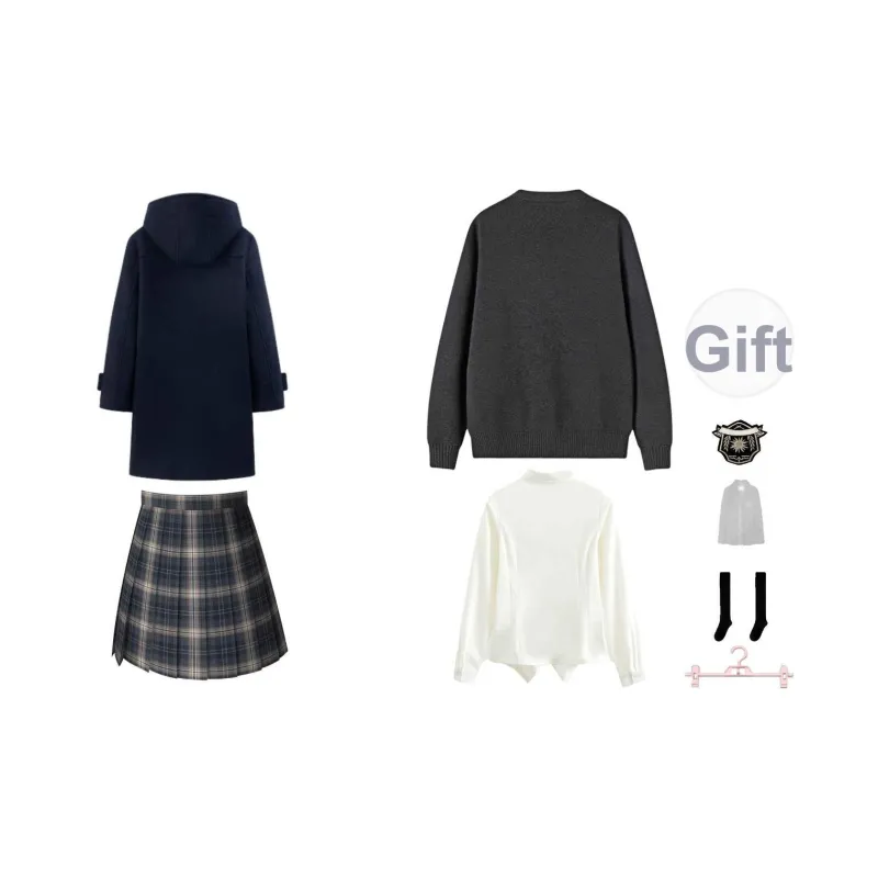 Темно-синий шерстяной пальто + темно-серый кардиган + белая длинная рубашка + шестиклассная короткая юбка + значок + пылезащитный чехол + вешалка
