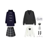 Темно-синий шерстяной пальто + серый кардиган + белая длинная рубашка + серая юбка + бант, значок + носки до икры + пылезащитный чехол + вешалка