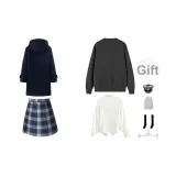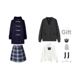 Темно-синий шерстяной пальто + темно-синий кардиган + белая длинная рубашка + январская короткая юбка + бант, значок + носки до икры + пылезащитный чехол + вешалка