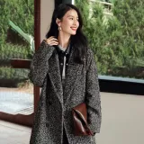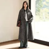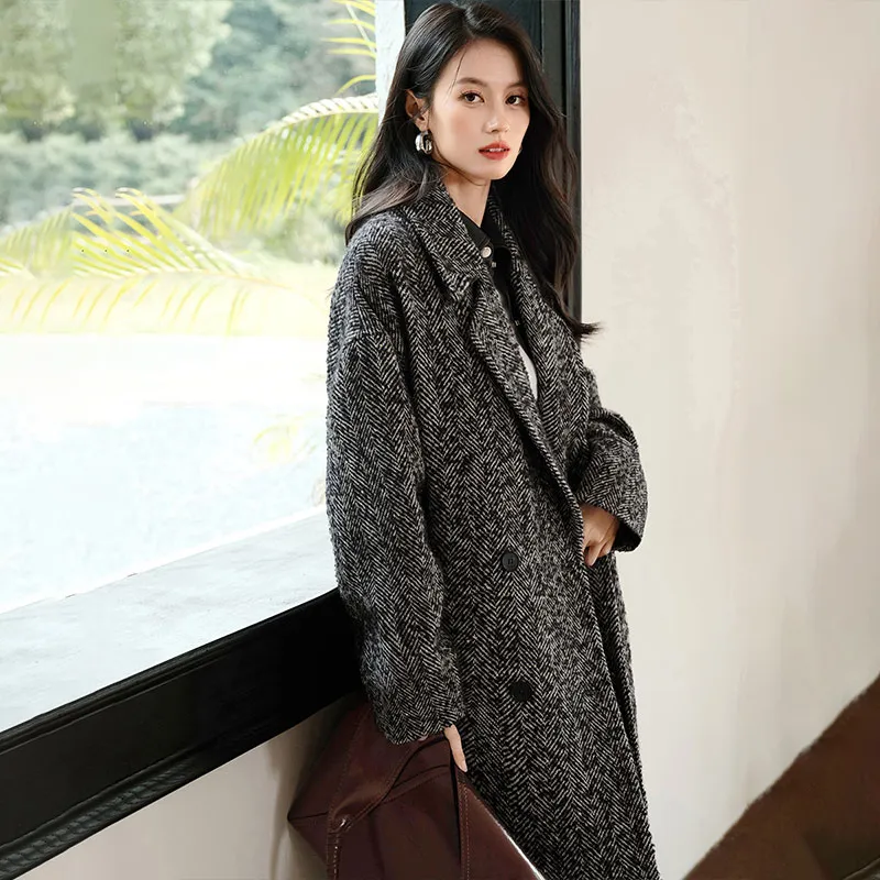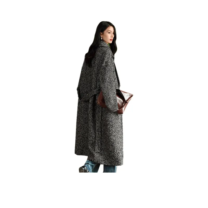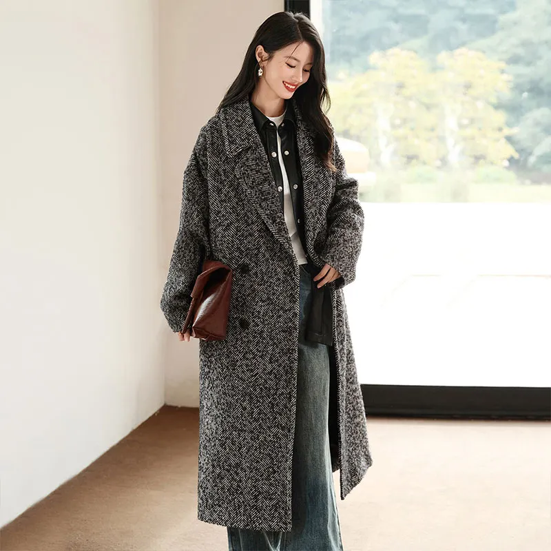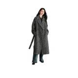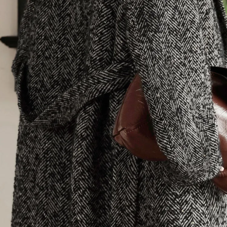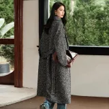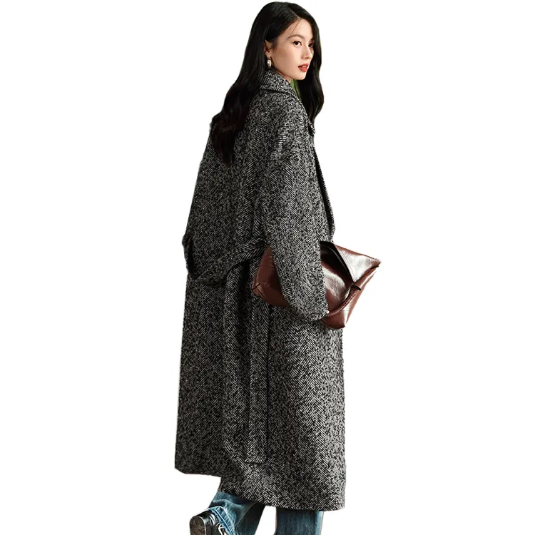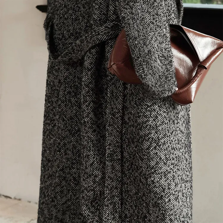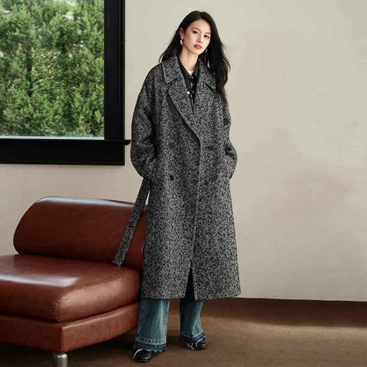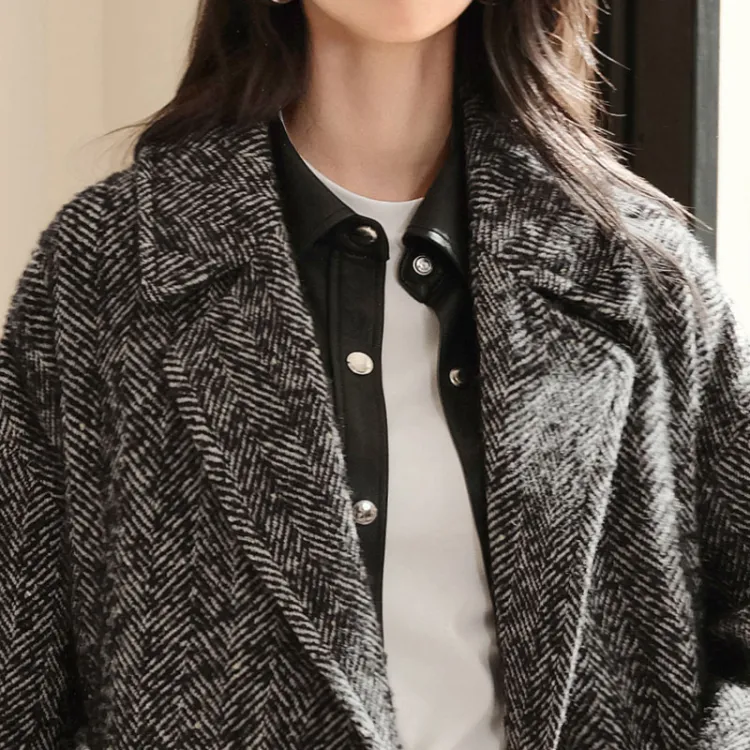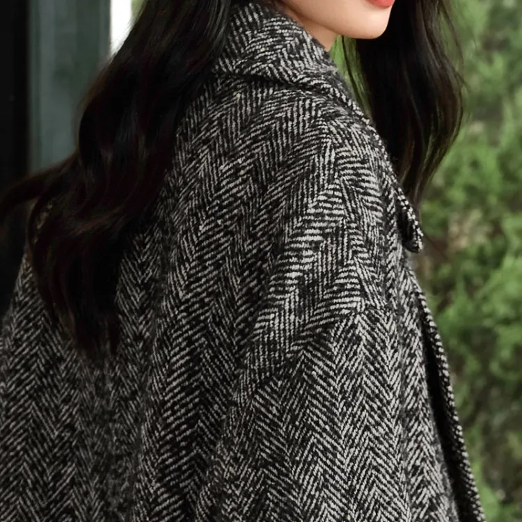 SIBAISHE Пальто Женское Черное с узором "Елочка"