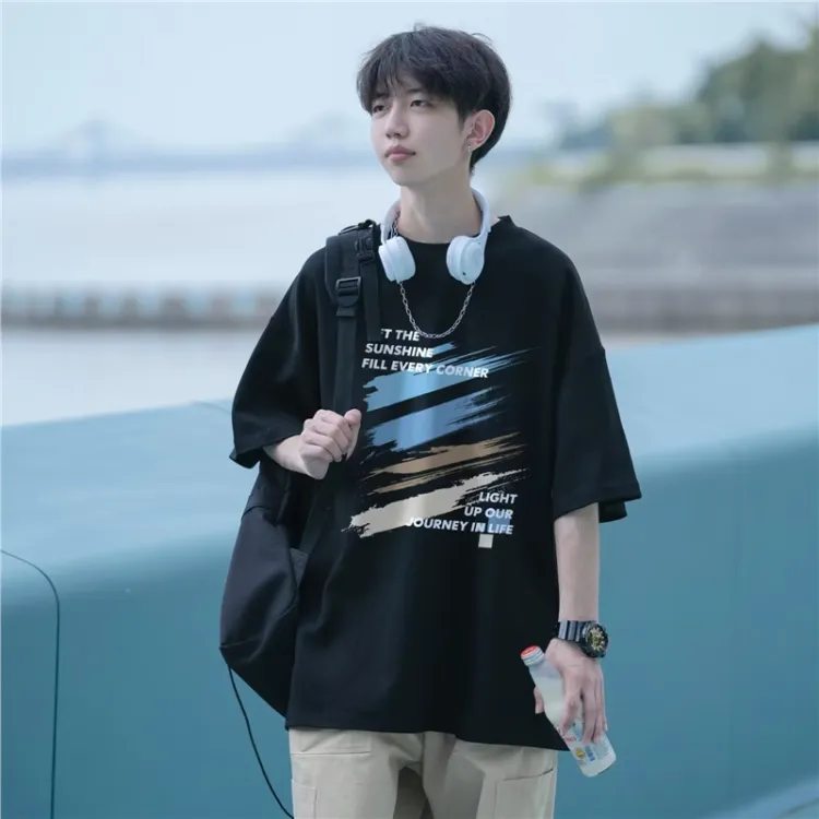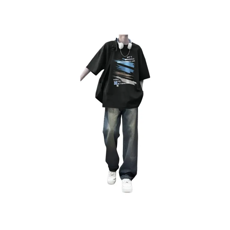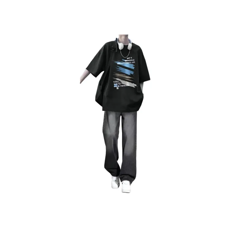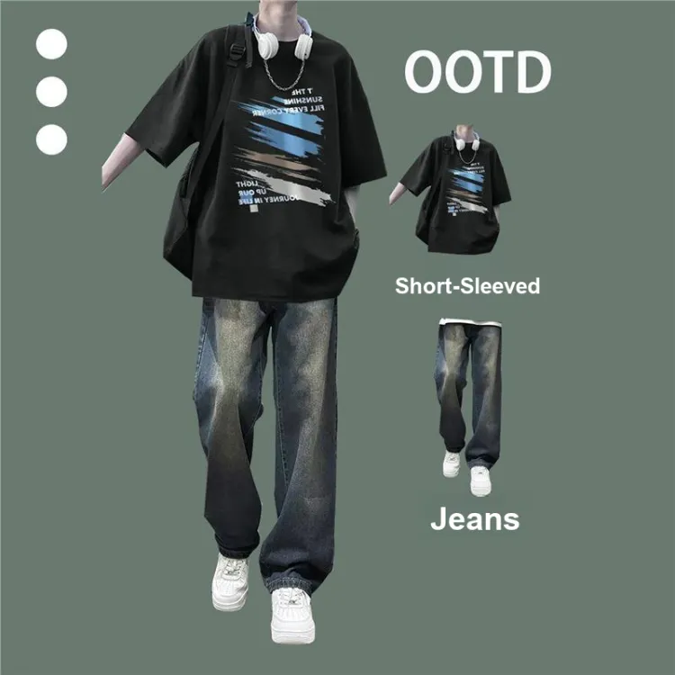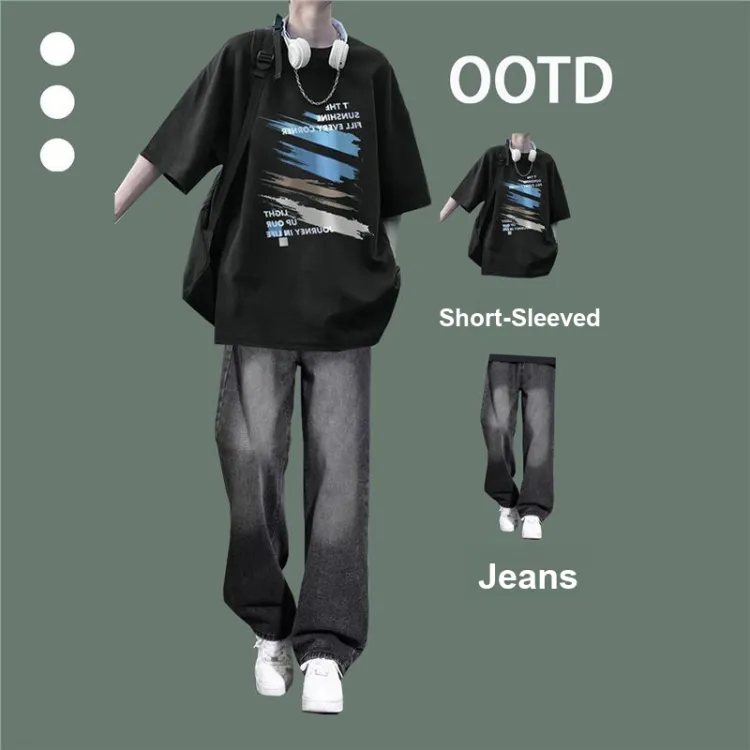Чёрный с короткими рукавами + серые джинсы